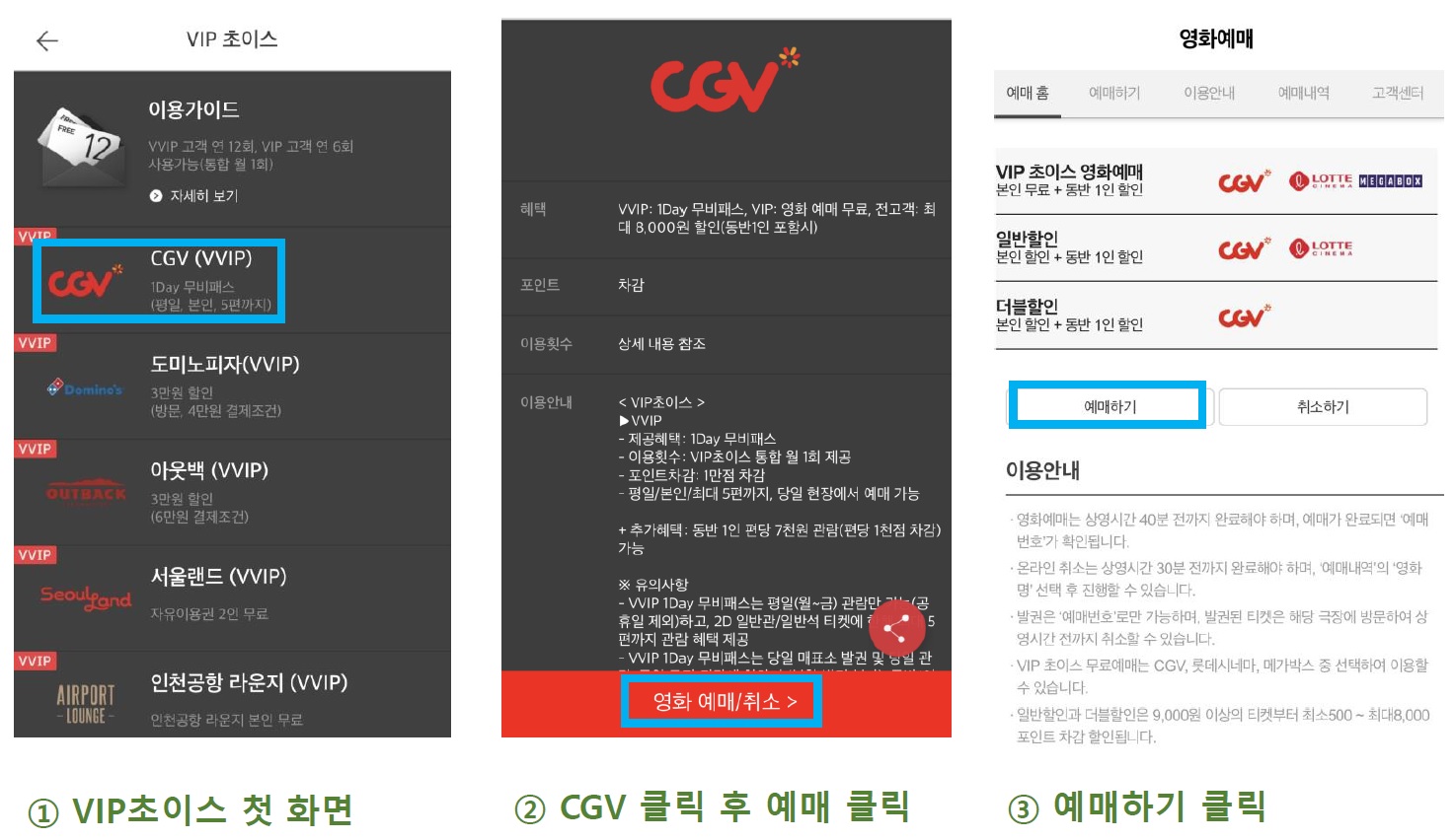 먼저 VIP초이스 탭을 누르고 => CGV 클릭 후, 영화예매를 누르고, 다시 예매하기를 클릭한다.