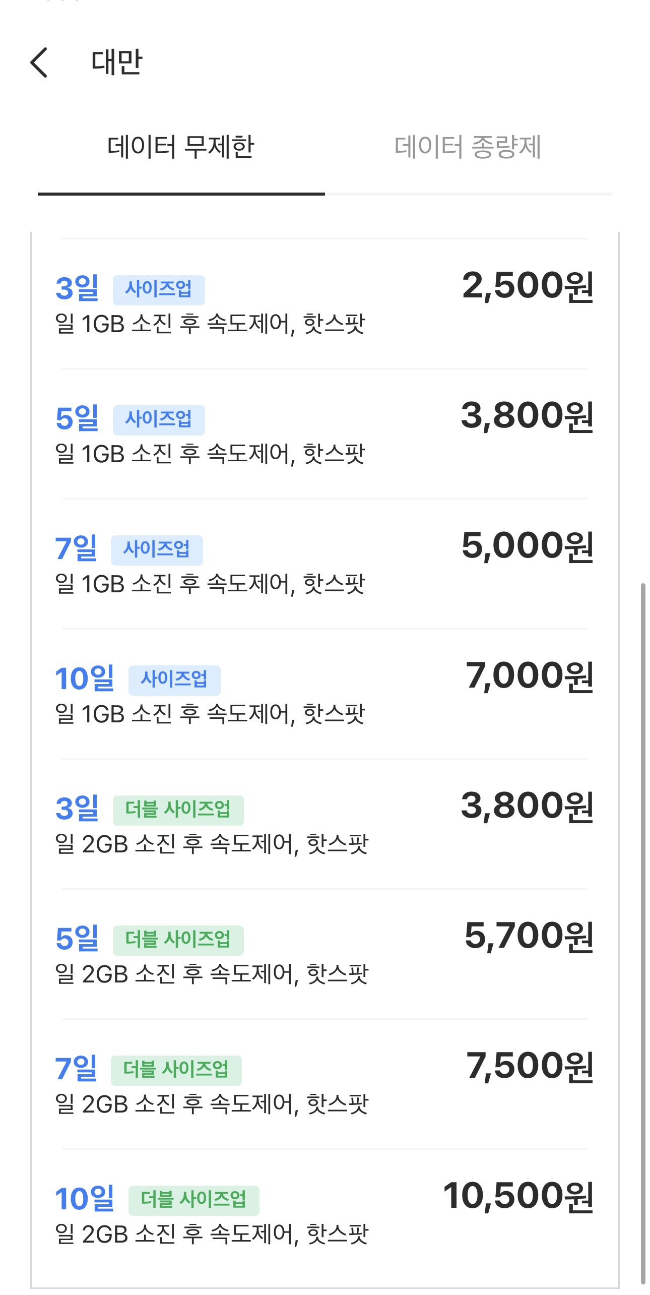 저는 대만여행에서 로깨비 e심 데이터 무제한 5일짜리를 선택했는데,