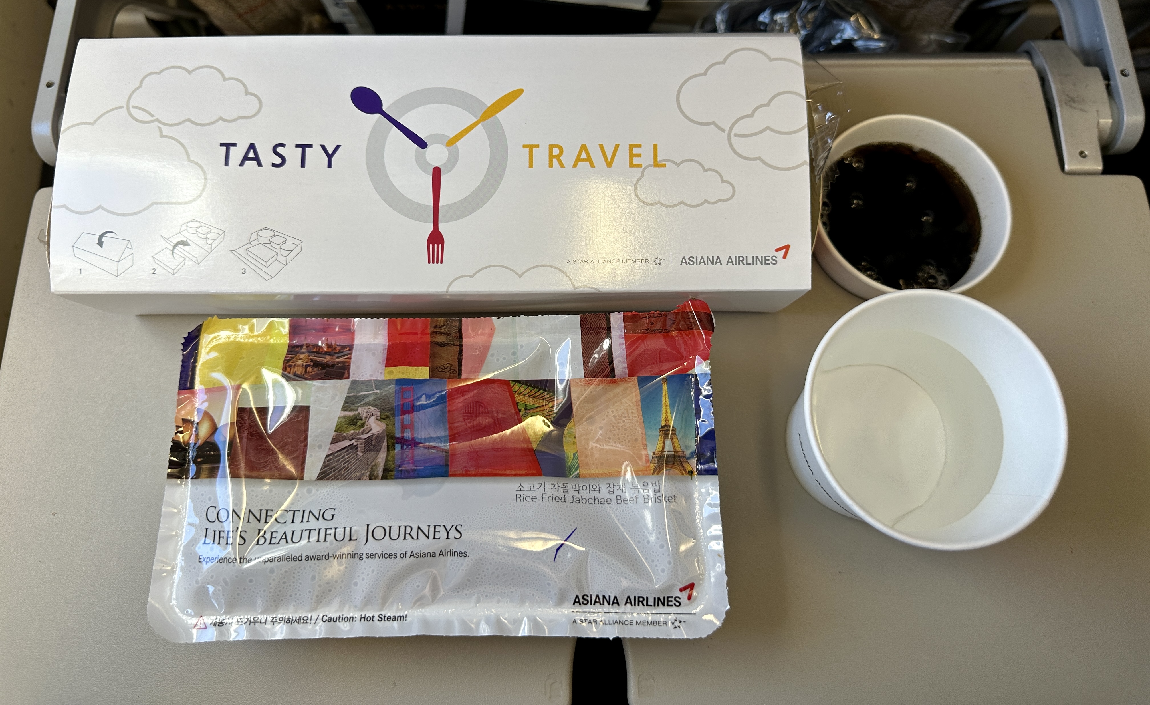 OZ713 기내식은 소고기 차돌박이와 잡채 볶음밥이 나왔는데, 고추장에 비벼먹으니