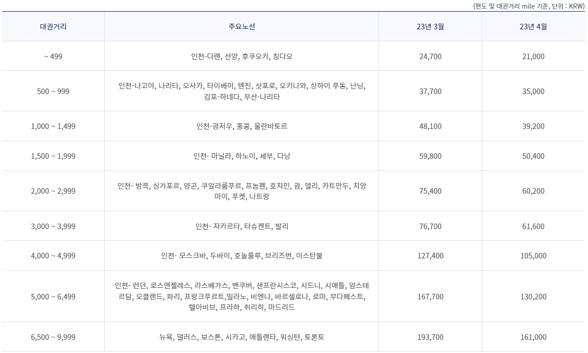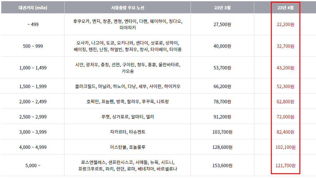 2023년 4월 대한항공 국제선 유류할증료 정보