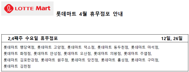 4월 롯데마트 휴무일 - 2,4째주 수요일