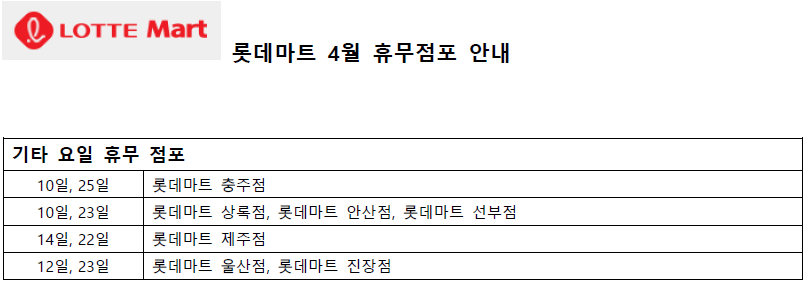 4월 롯데마트 휴무일 - 2,4째주 일요일