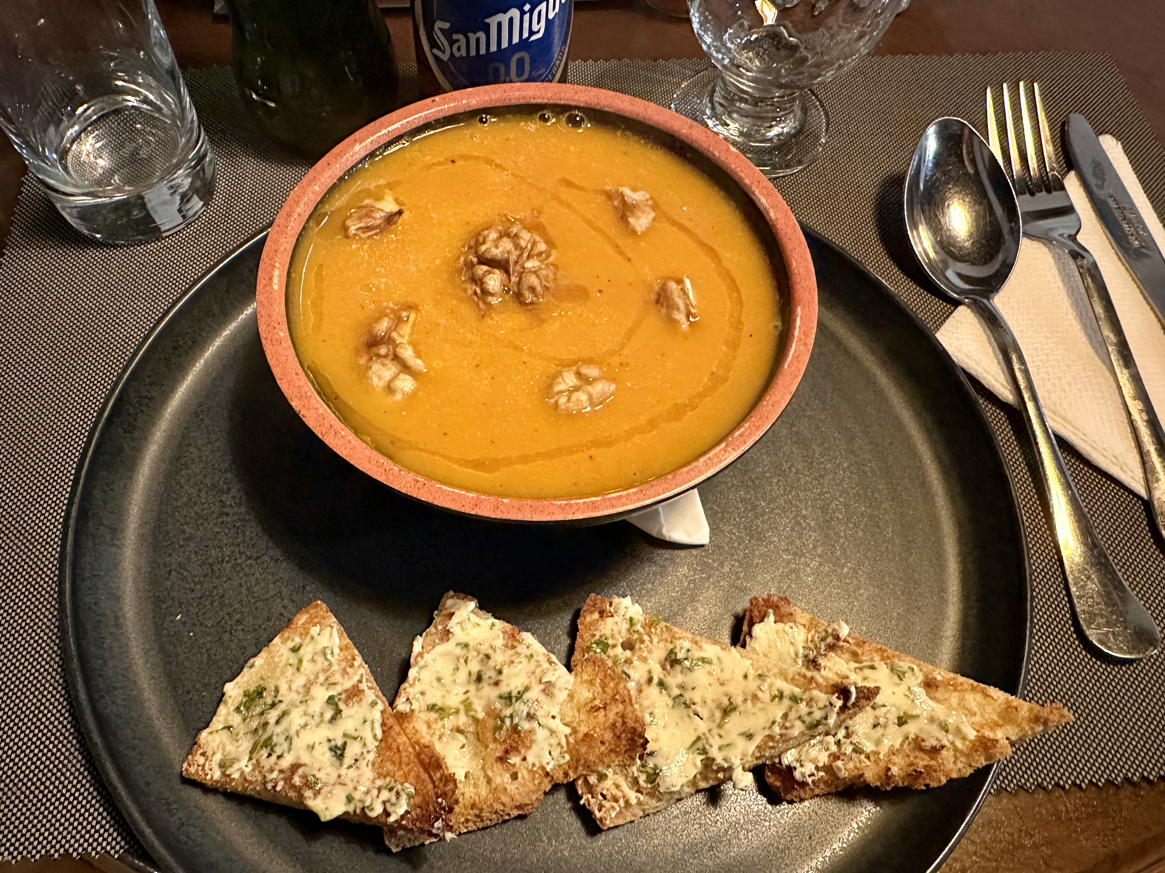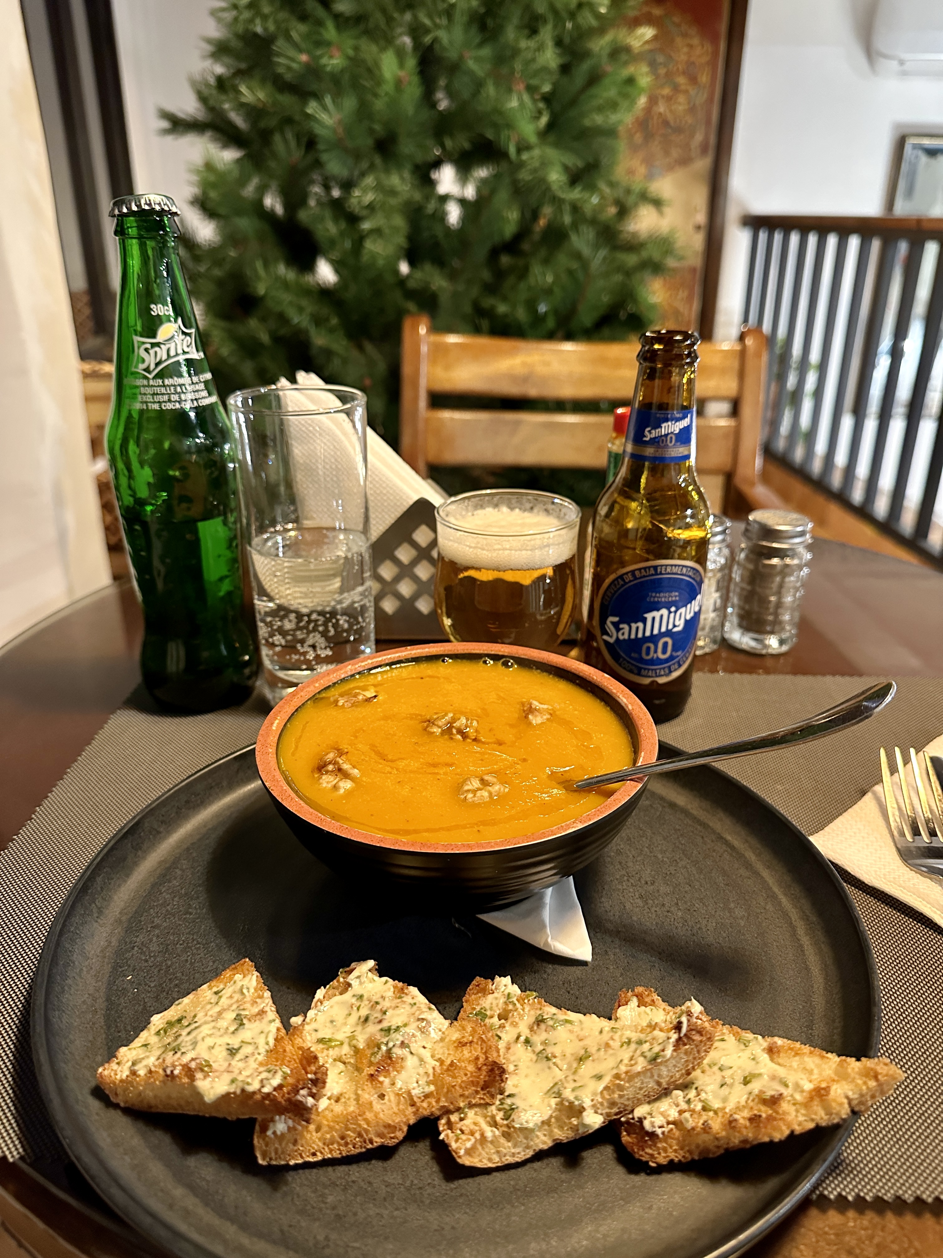 여기에 호박수프를 추가해서 바게트를 찍어먹었고 논알콜 맥주인 산미구엘 0.0과