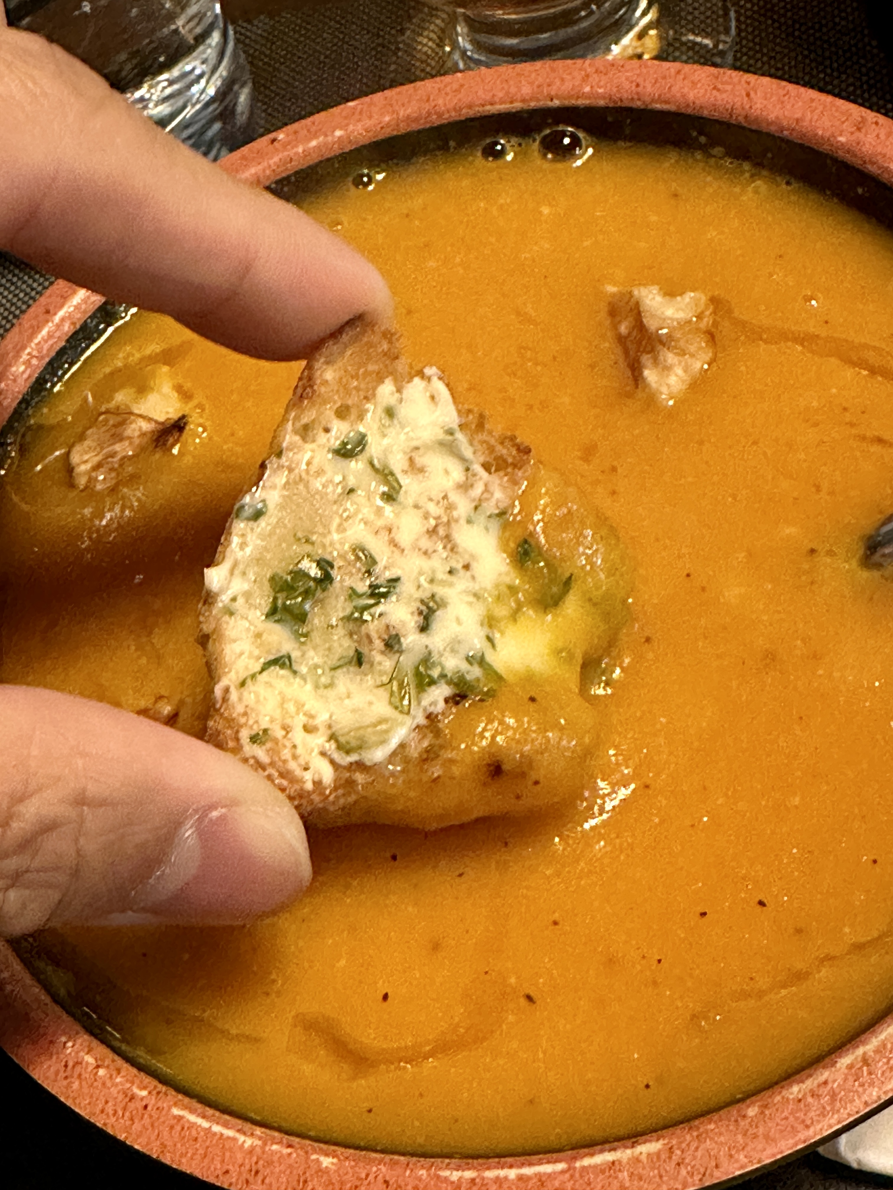 호박죽에는 호두가 들어있어 더 맛있었고 바게트를 찍어 먹으니 더욱 맛이 조화가 좋았습니다.