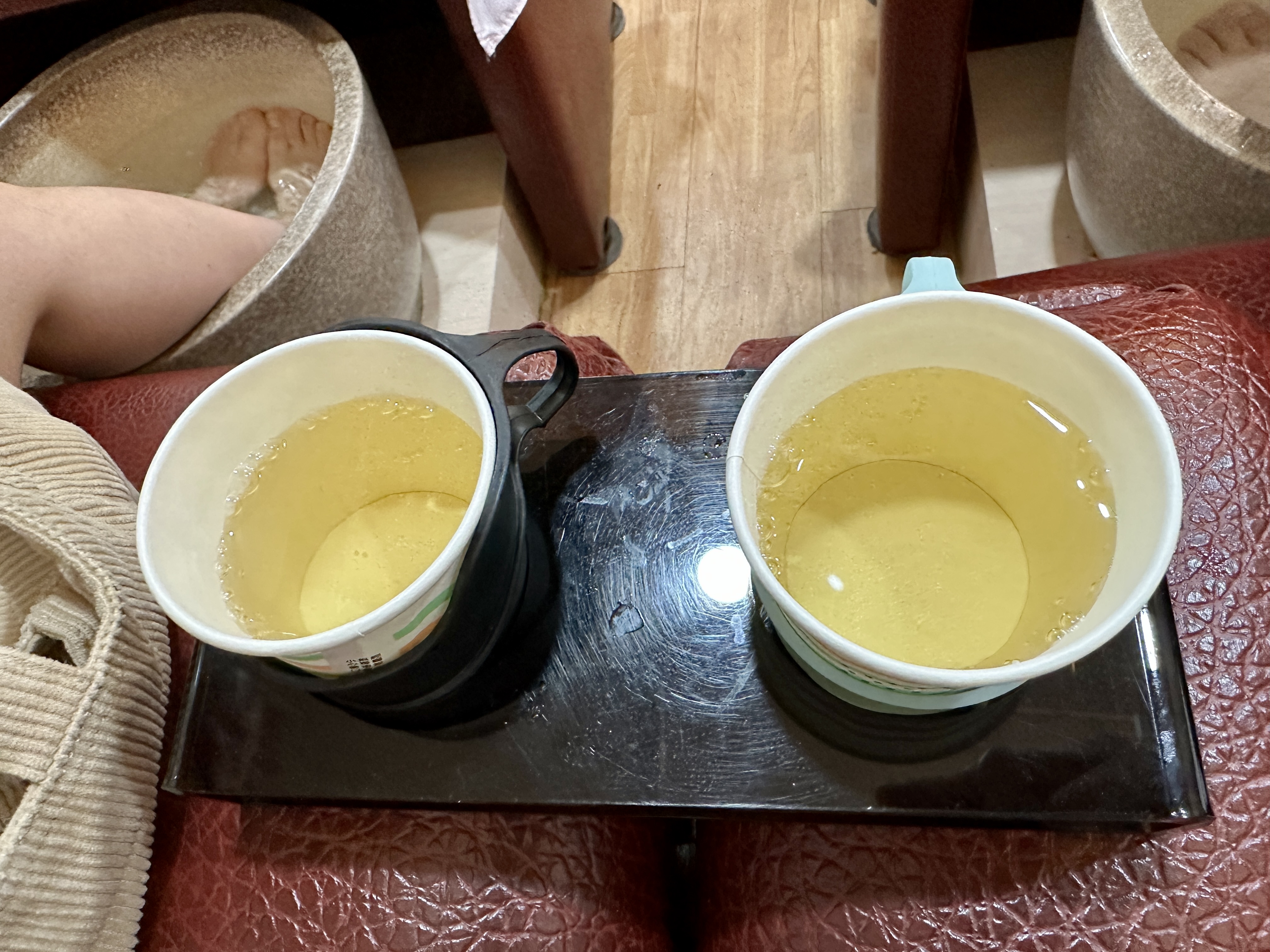 족욕부터 시작되는 50분짜리 발과 목 마사지는 차를 마시며 함께 시작됩니다.