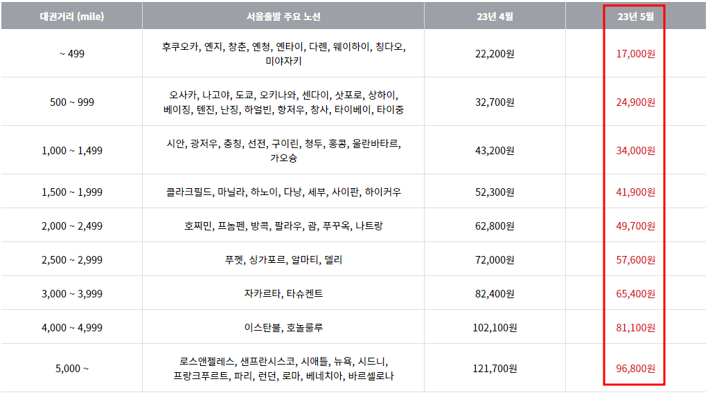2023년 5월 1일부터(발권일 기준) 대한항공에 적용되는 국제선 유류할증료는 위 테이블과 같습니다.