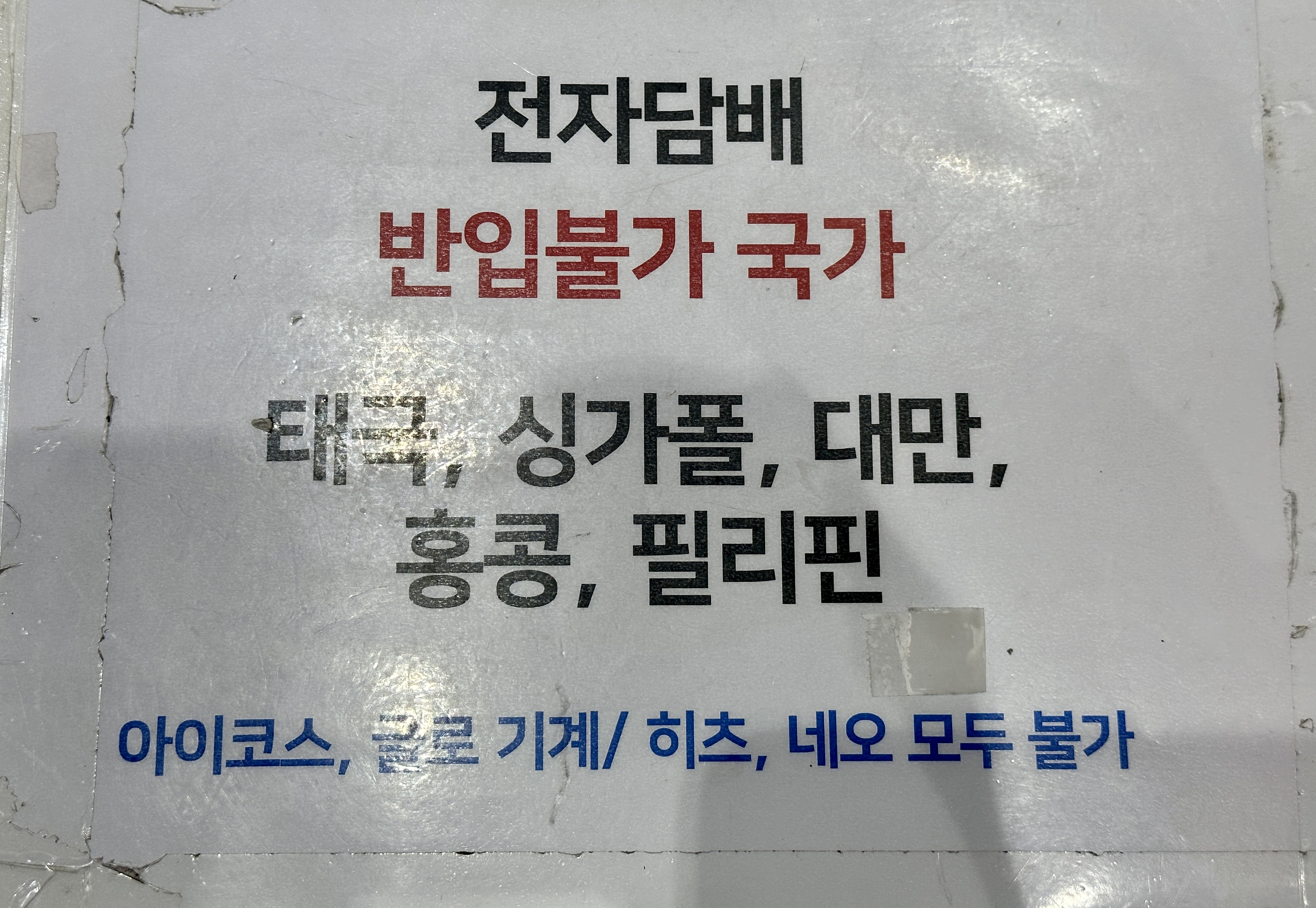 특히 전자단배 반입불가 국가로 태국, 싱가폴, 대만, 홍콩, 필리핀등이 써 있었는데