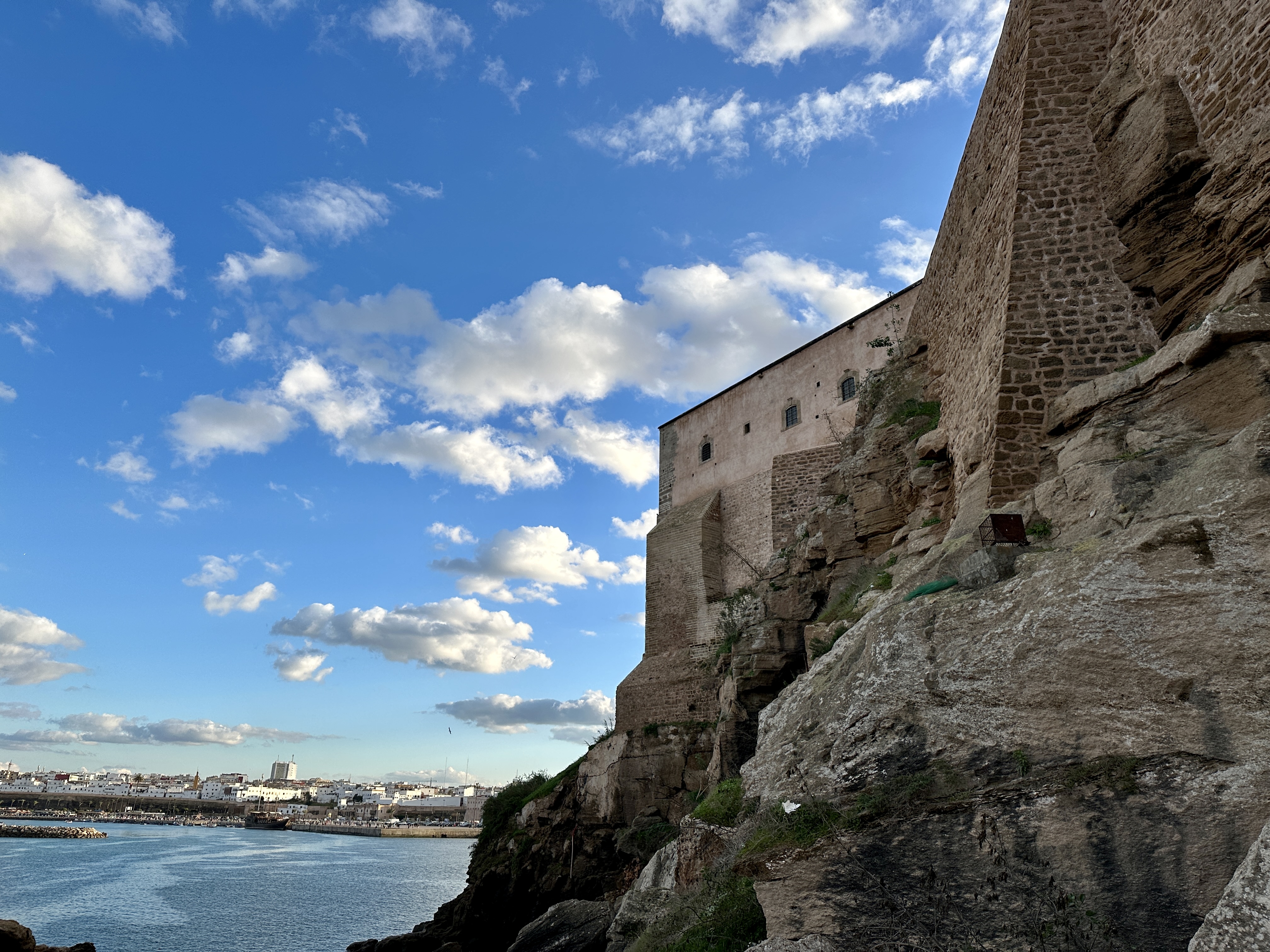 아래에서 내려다 본 카스바 우다이아 성벽은 푸른 하늘과 하얀구름과 어우러져 장관이었습니다.