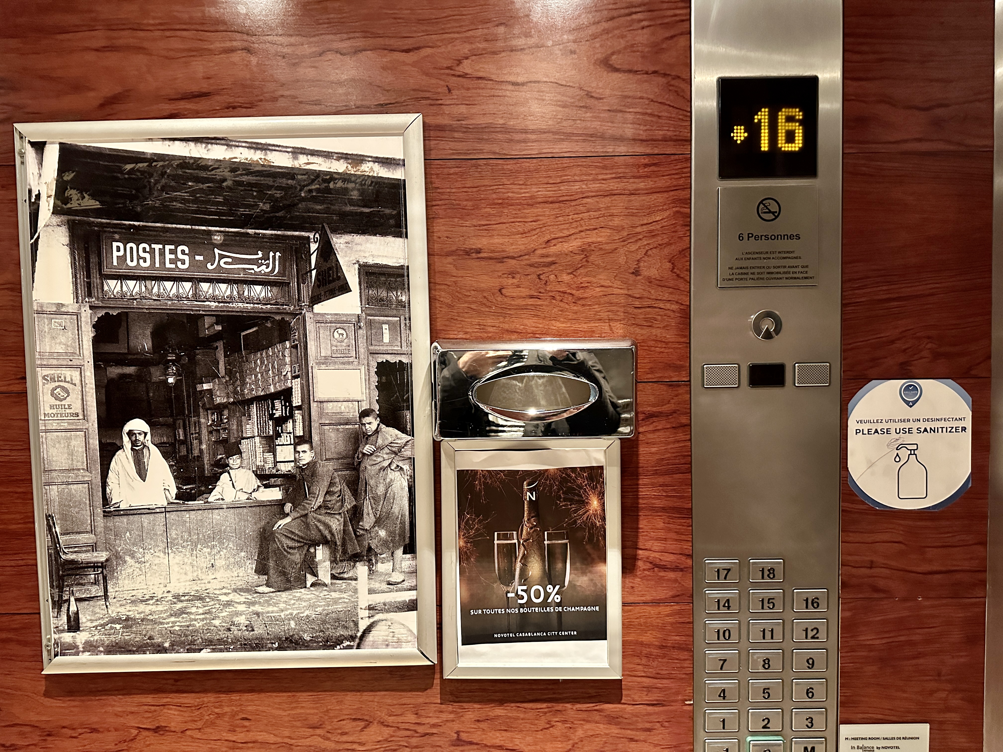 노보텔 엘리베이터에는 카사블랑카의 역사를 느낄 수 있는 사진과 감각적인 인테리어로 꾸며져 있었습니다.
