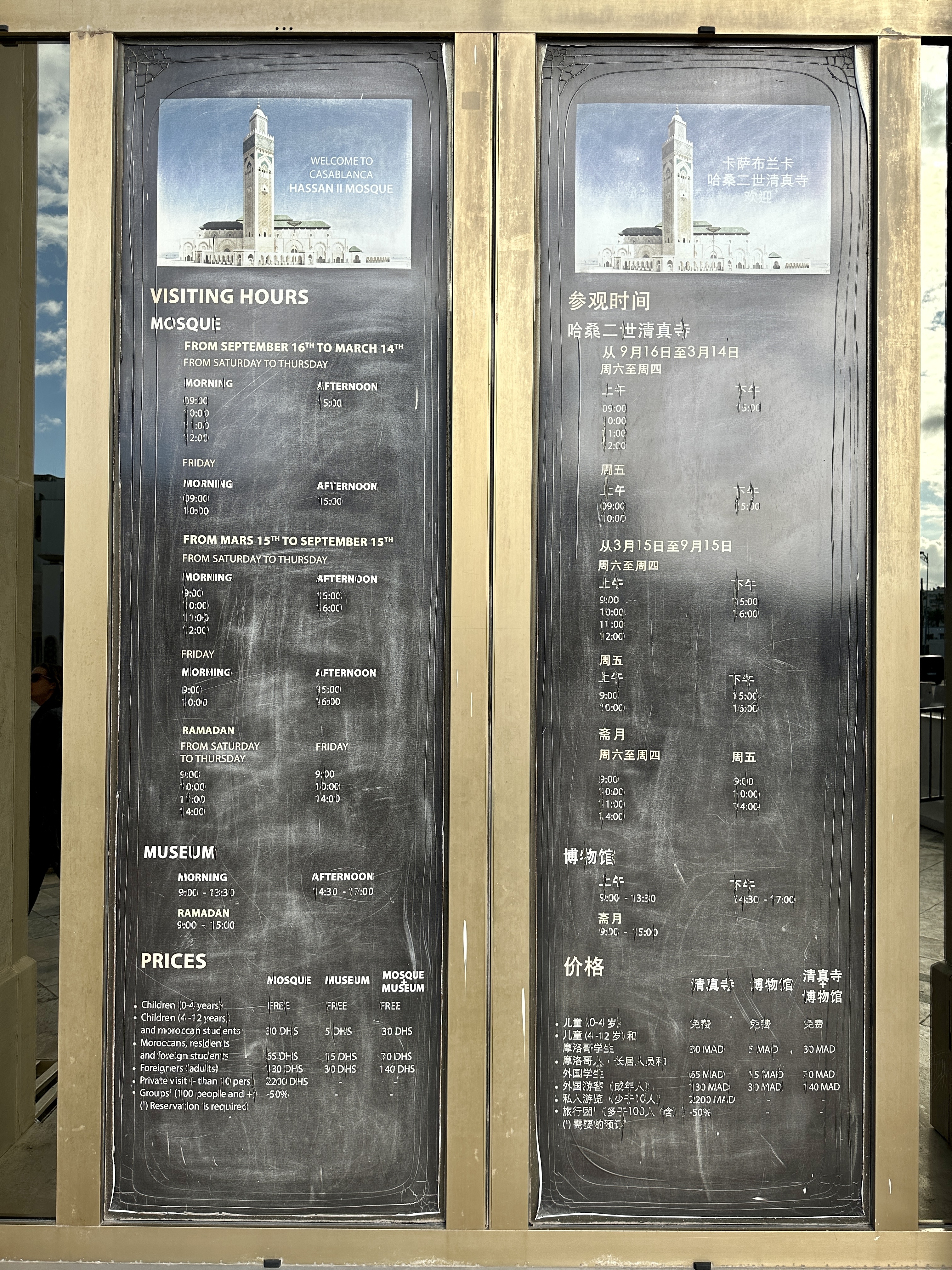 하산2세 모스크 투어 비용은 모스크만 보는것이 130 디르함이고 박물관을 보는것이 30 디르함으로