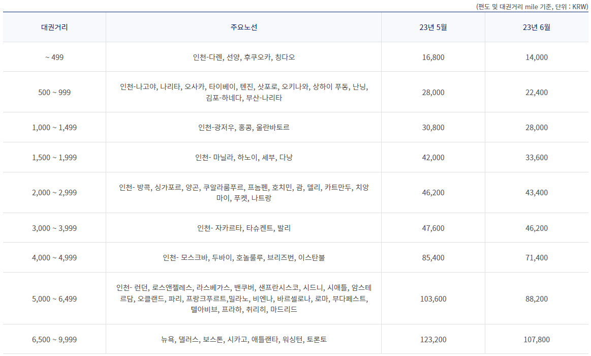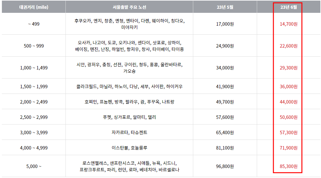 2023년 6월 대한항공 국제선 유류할증료 정보