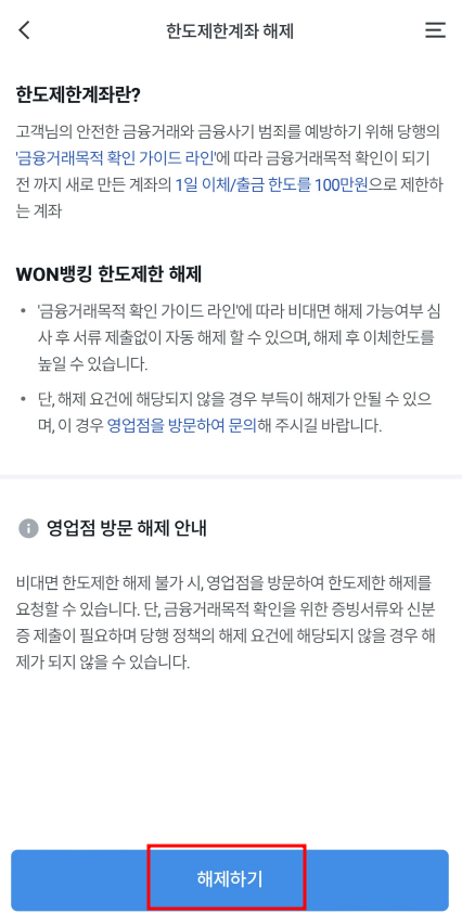 WON뱅킹 한도제한 해제는 서류제출 없이 자동해제 할 수 있으며, 또한 해제후 이체한도를 높일 수 있습니다.