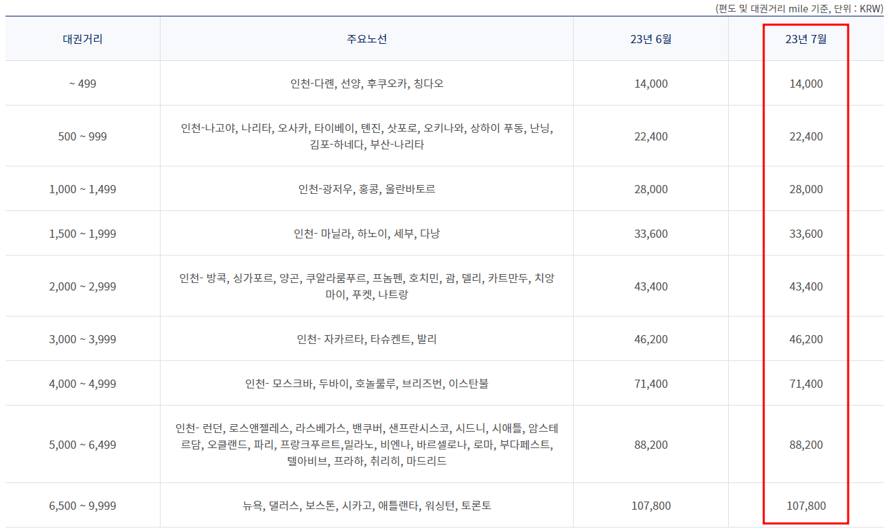 2023년 7월 대한항공 국제선 유류할증료 정보