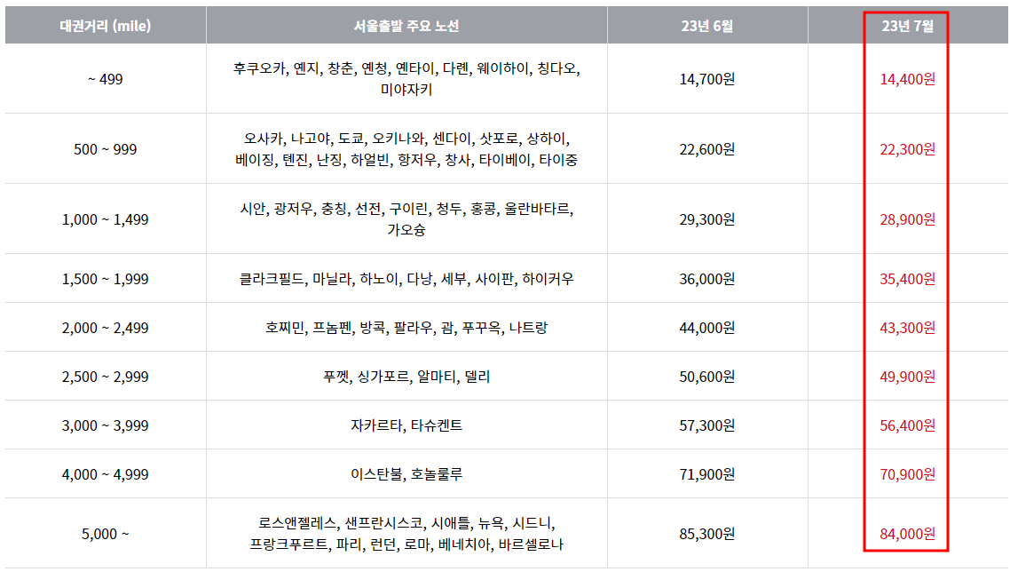 2023년 7월 국제선 유류할증료 정보
