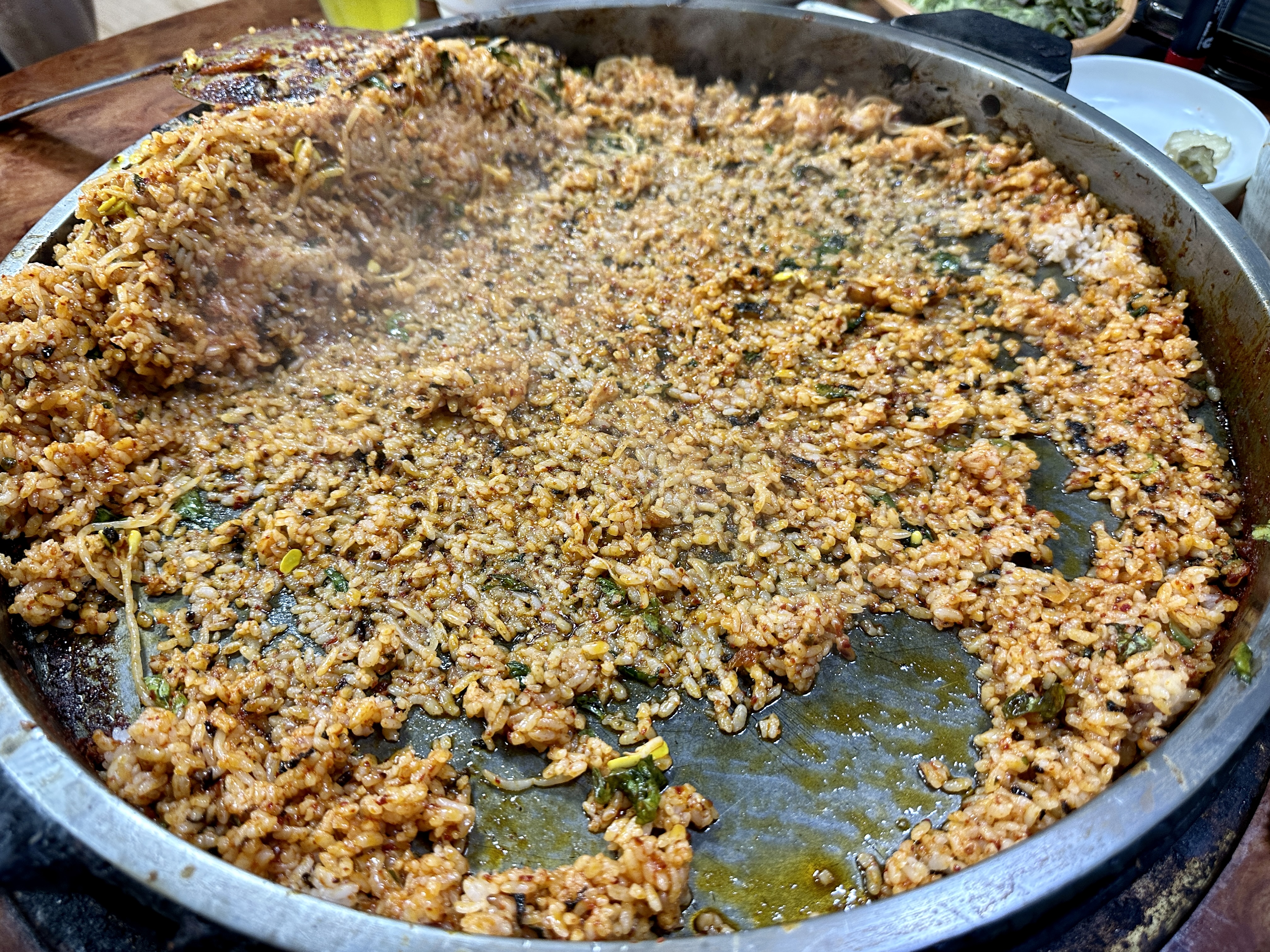 3인분의 닭갈비는 뚝딱 해치우고, 하이라이트인 누룽지 볶음밥을 볶아 먹었습니다.