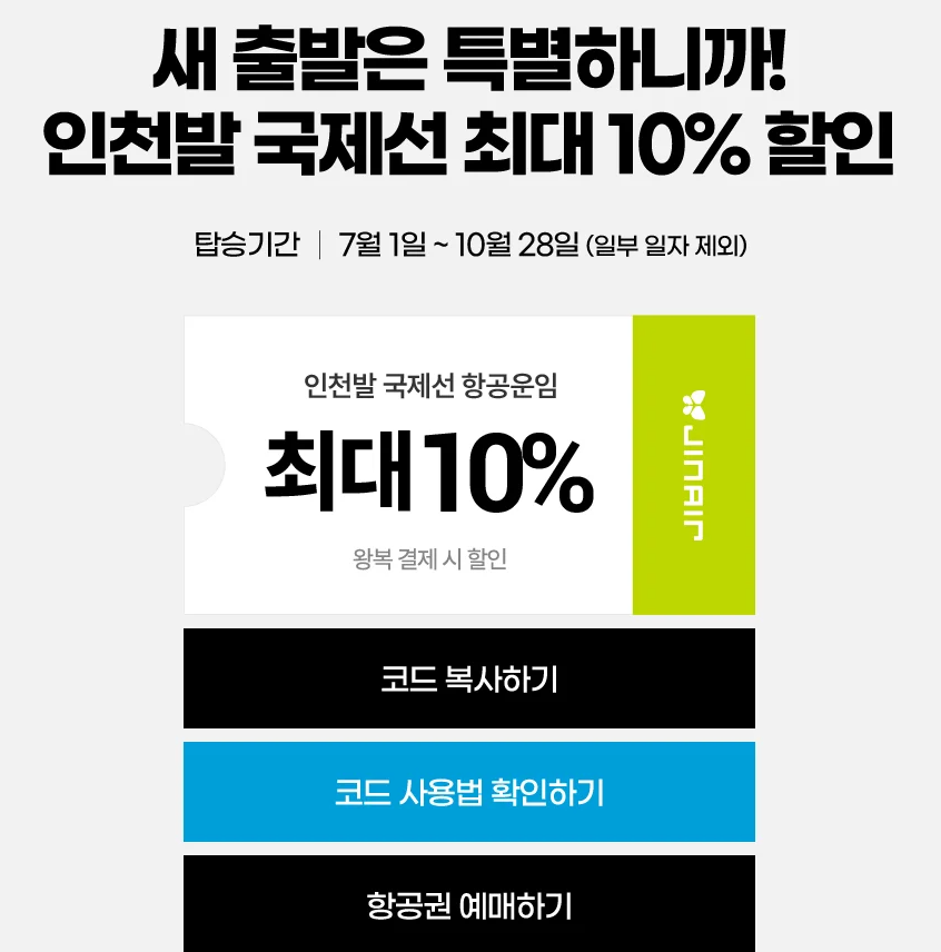 진에어 인천발 국제선 최대 10%할인 이벤트 (왕복 결제 시 할인)