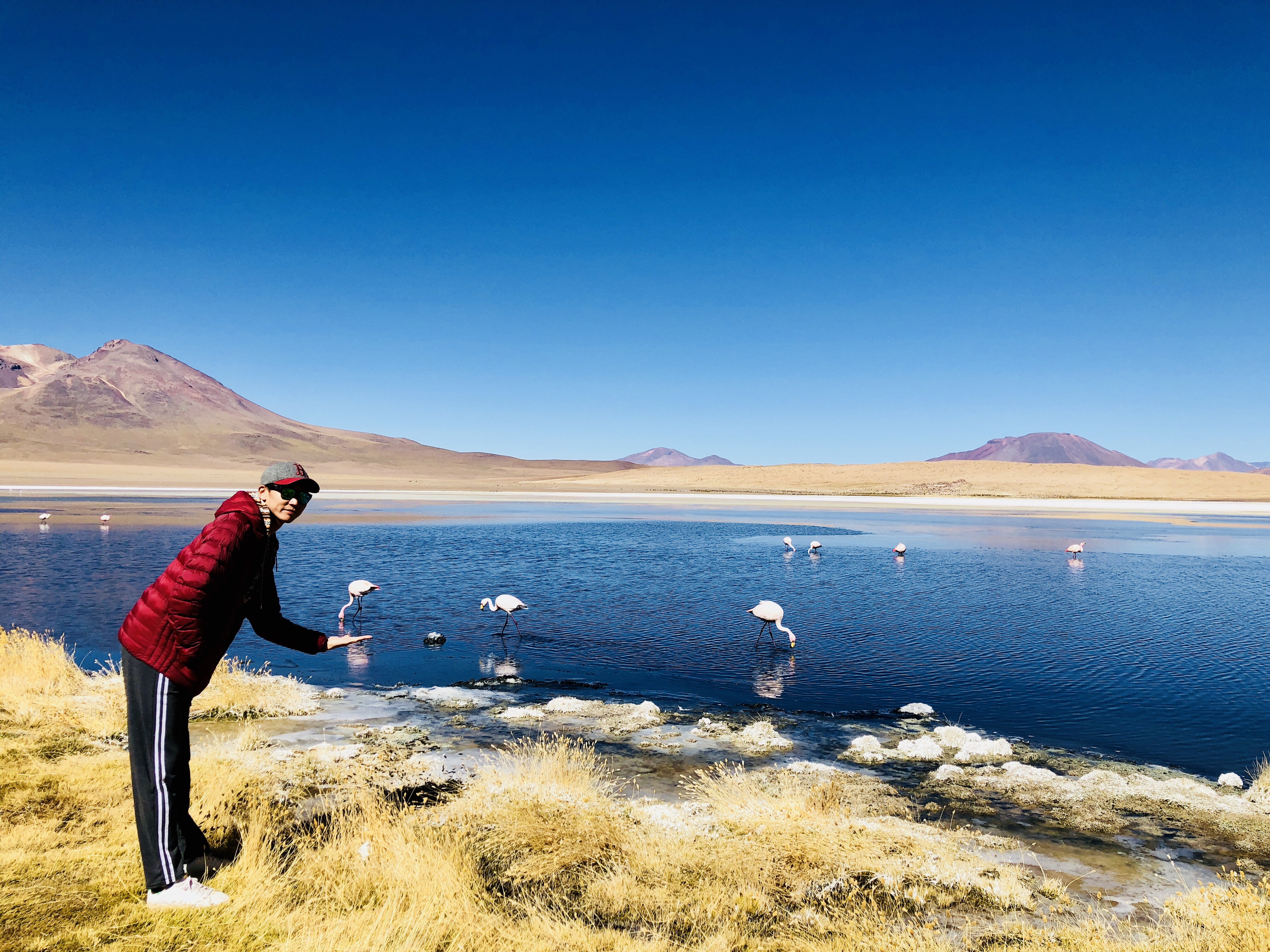 대자연을 느낄수 있는 산에 둘러쌓인 얕은 호수에서 플라밍구들이 자유롭게 먹이도 먹으며 쉬고 있었고,