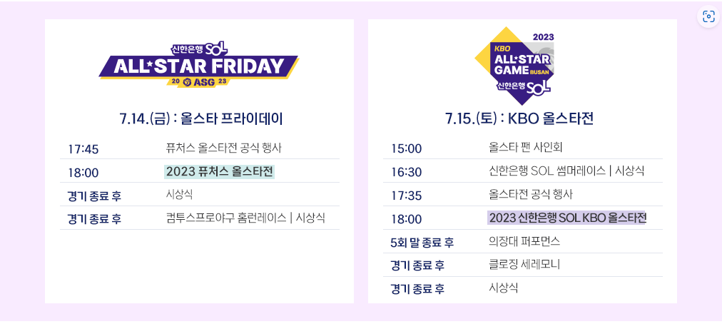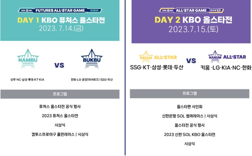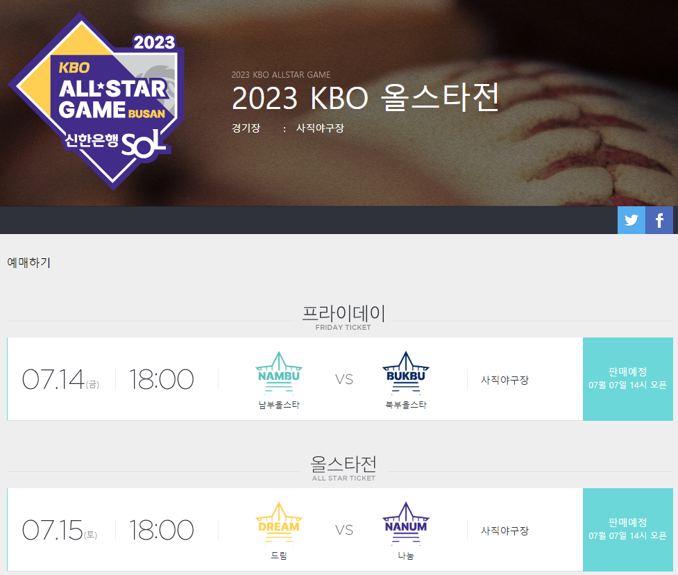 참고로 2023 프로야구 올스타전은 7월 15일(토) 18시에 부산 사직야구장에서 열립니다.