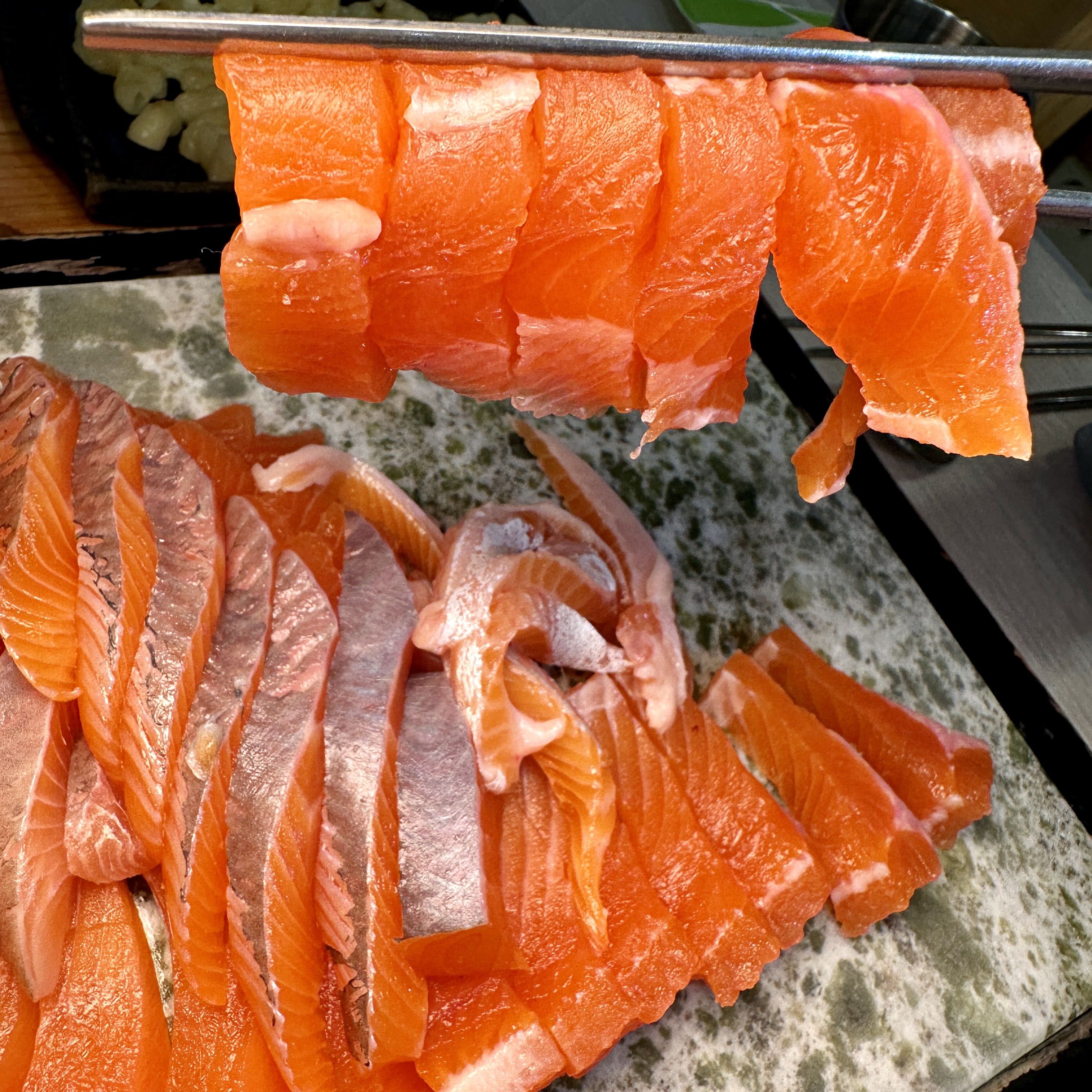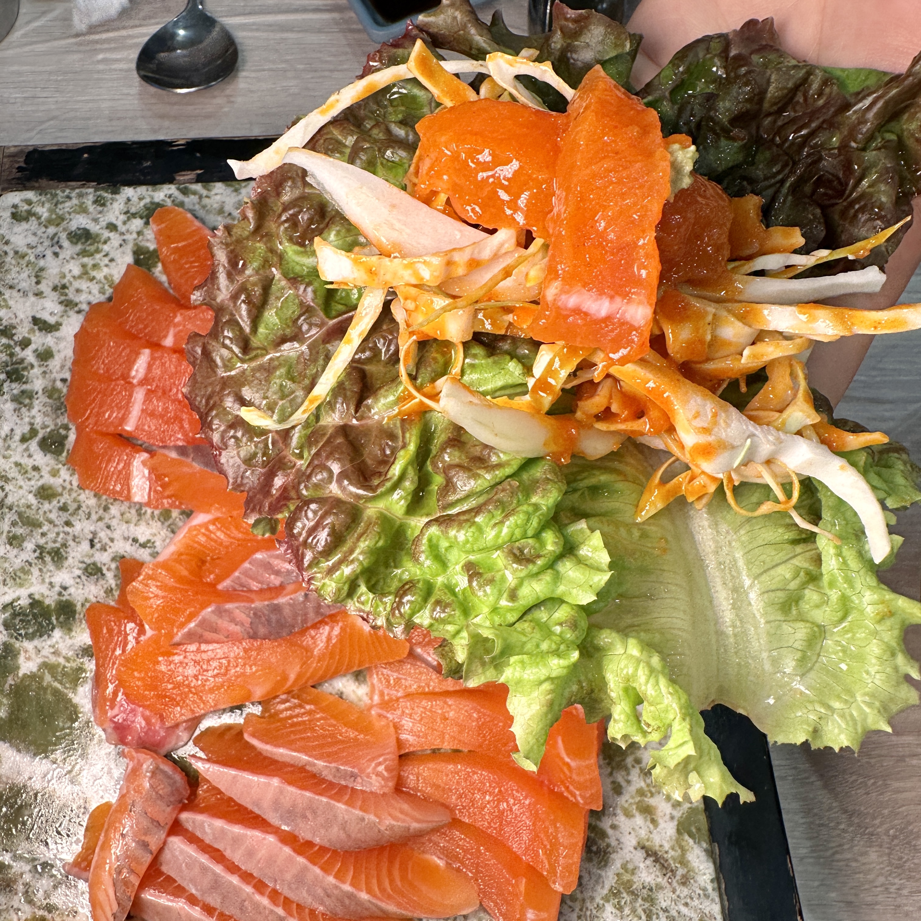4. 야채무침과 맛있게 송어회를 먹는다.