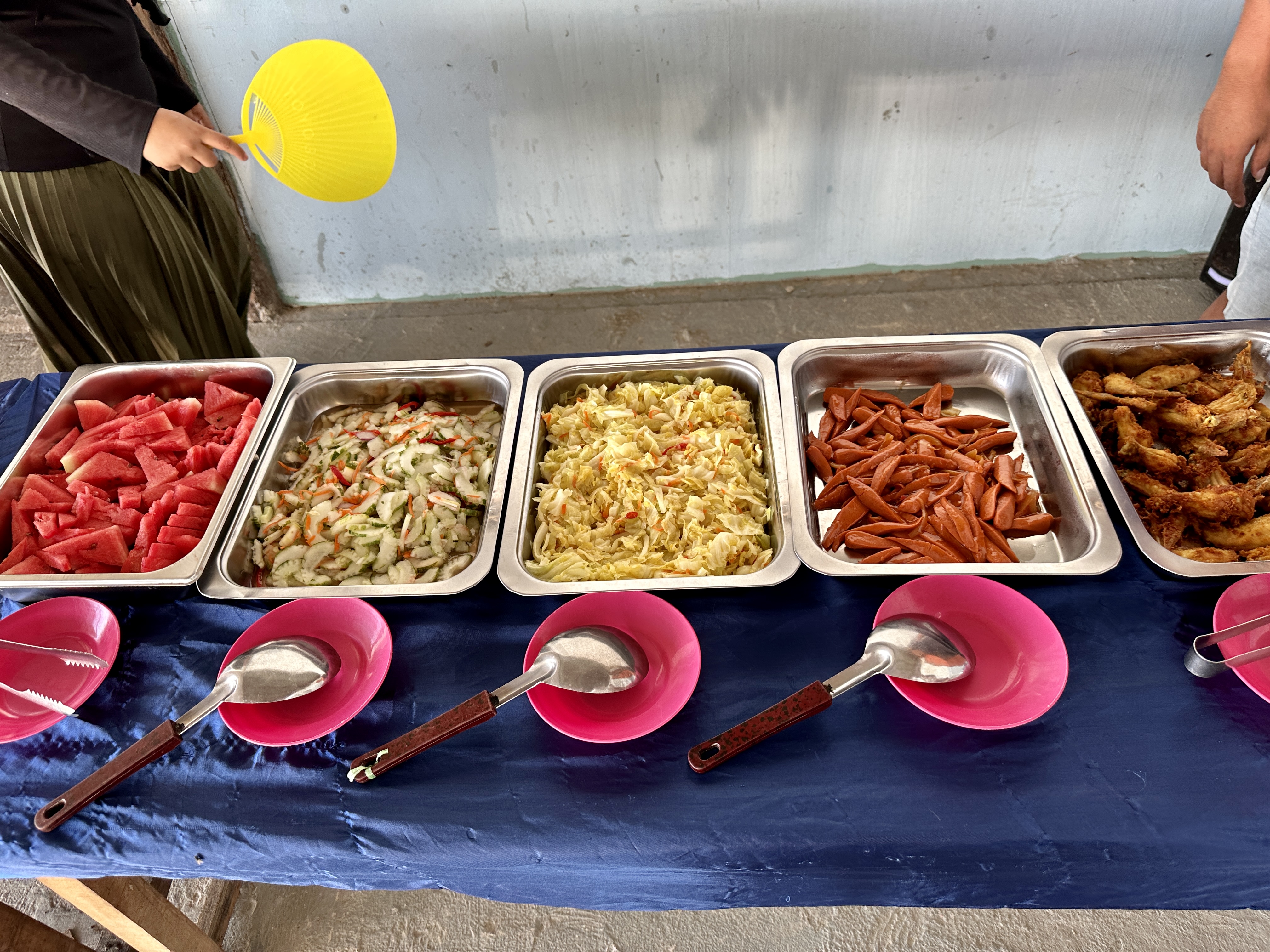 말레이시아 전통식에 닭 튀김과 각종 채소와 수박이 후식으로 준비되어 있었습니다.