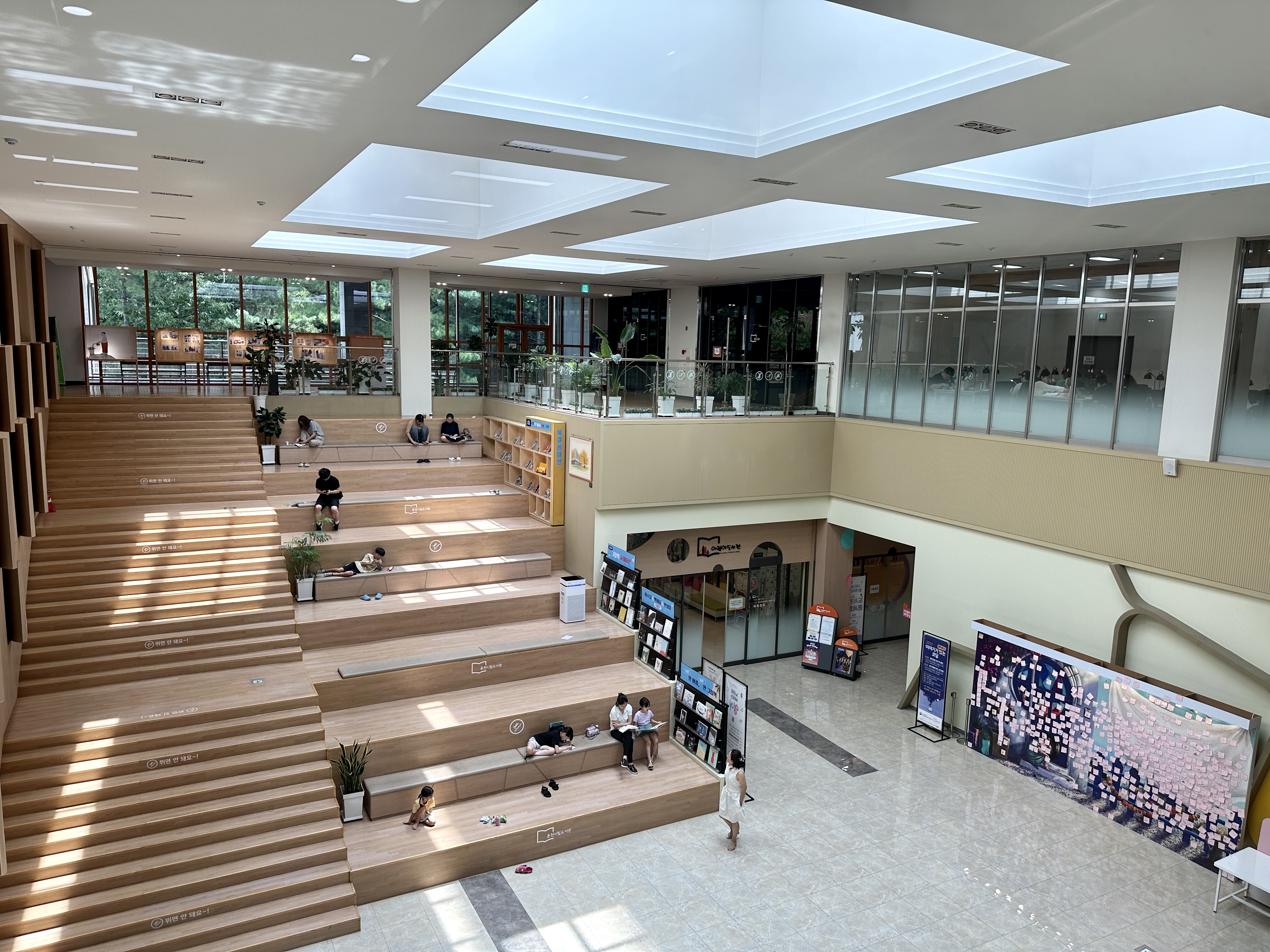 춘천시립도서관에 들어서면 전면에 독서할 수 있는 야외 개방형 큰 계단공간이 있습니다.