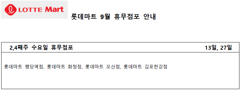 2,4째주 수요일인 9월 13일과 9월 27일에는 4개 점포의 롯데마트가 휴무하게 됩니다.