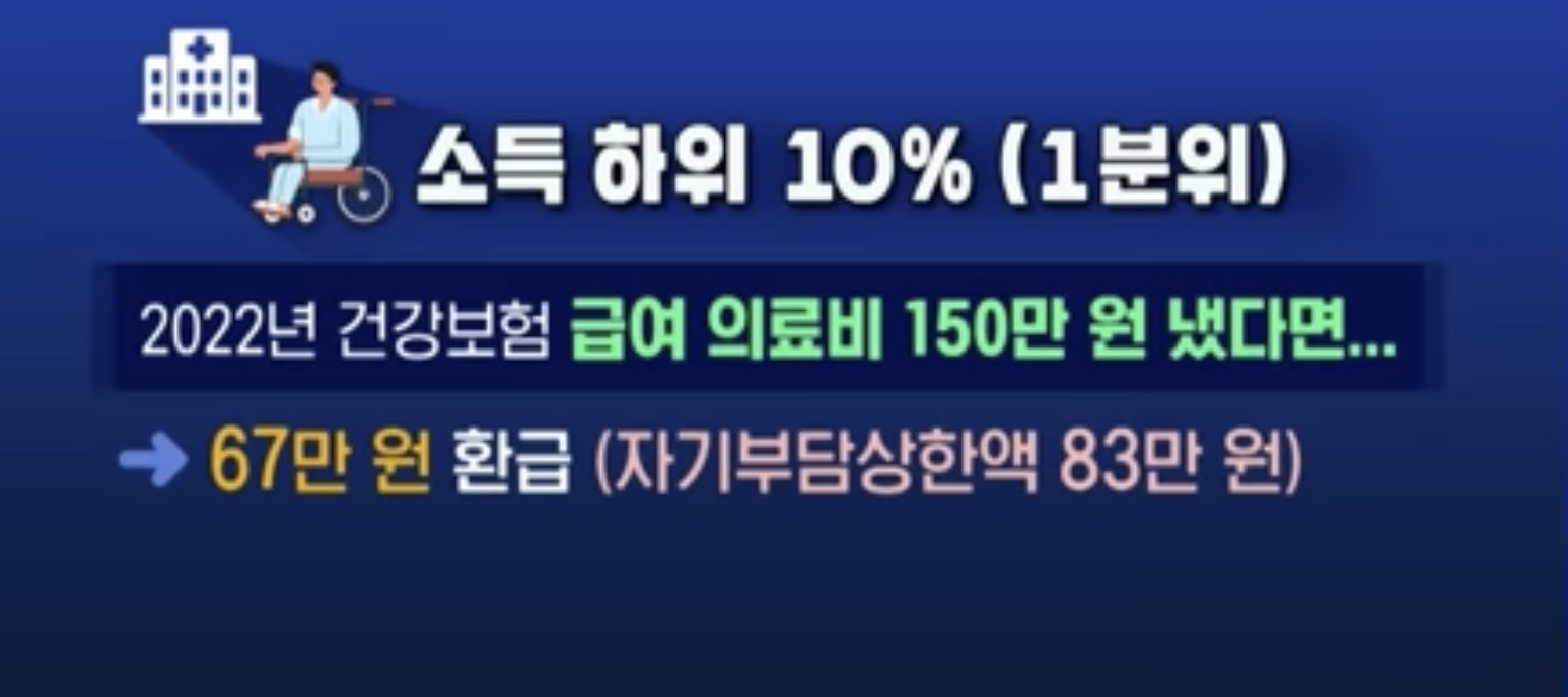 예를들어 소득 하위 10%인 1분위에 속한 소득자가 2022년 급여 의료비 150만원을 지출했다고 가정하면, 자기부담 상한액인 83만원을 넘는 금액인 67만원을 환급받게 됩니다.