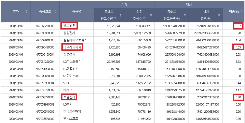 또한, 아모레퍼시픽과 신라호텔등 전통적인 중국 관련주식들에도 공매도가 많이 쌓여있다.