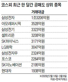 최근 1달, 삼성전자와 아모레퍼시픽, 셀트리온 등의 대형주에서 공매도가 거래가 많이 발생했다.