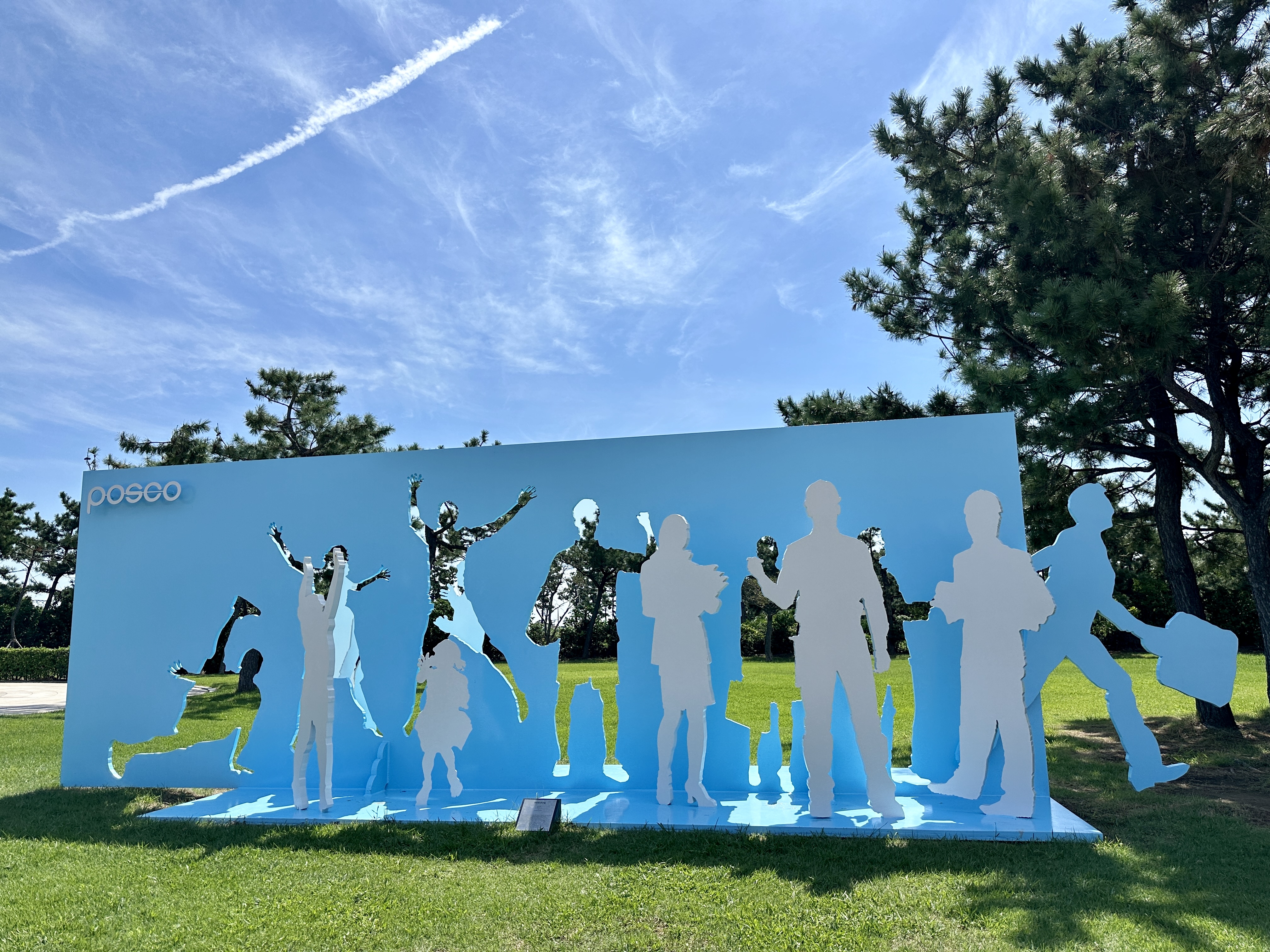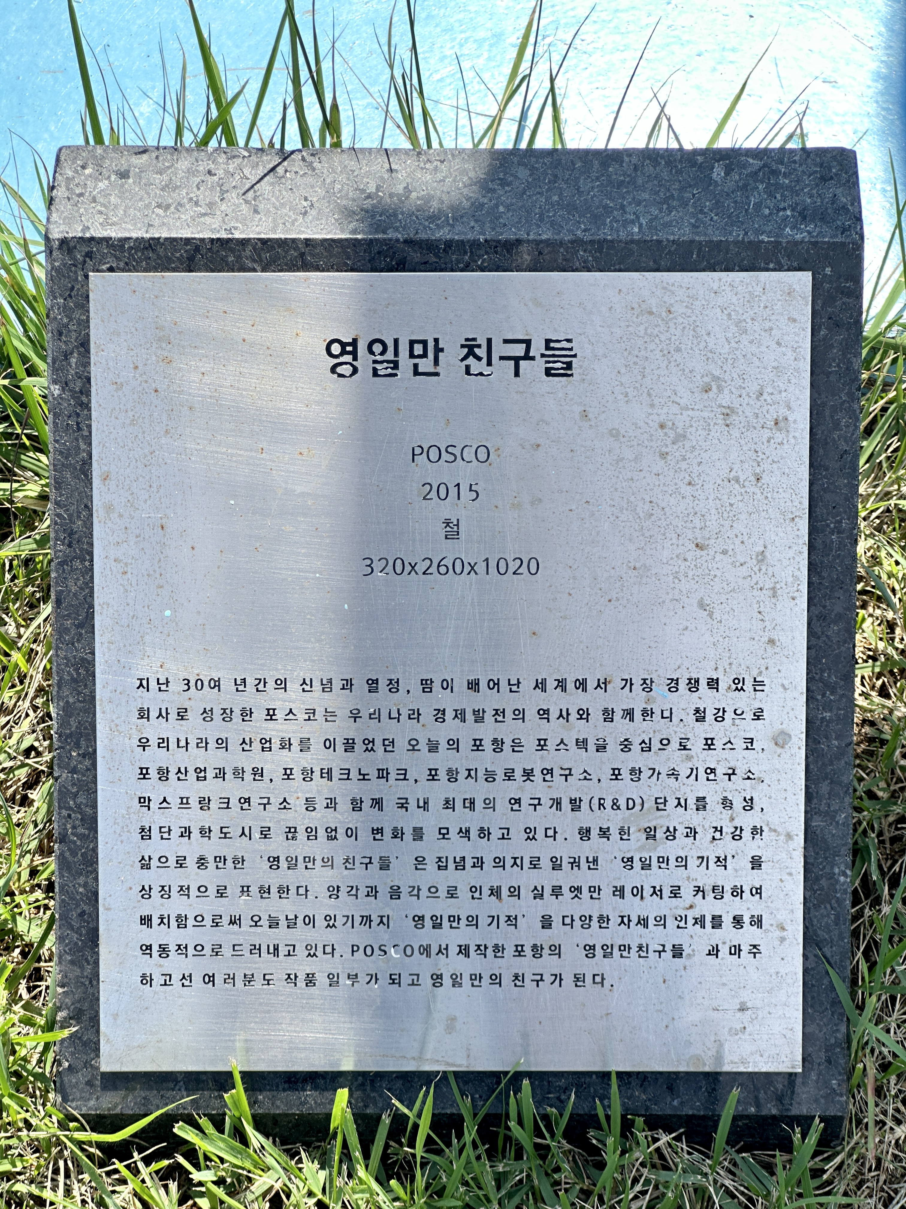 행복한 일상과 건강한삶으로 충만한 '영일만의 친구들'은 집념과 의지로 일궈낸 '영일만의 기적'을 상직적으로 표현하며, 양각과 음각으로 인체의 실루엣만 레이저로 커팅하여 배치함으로써 오늘날이 있기까지 영일만의 기적을 다양한 자세의 인체를 통해서 역동적으로 드러내고 있습니다. 이 작품은 포스코에서 제작했다고 합니다.