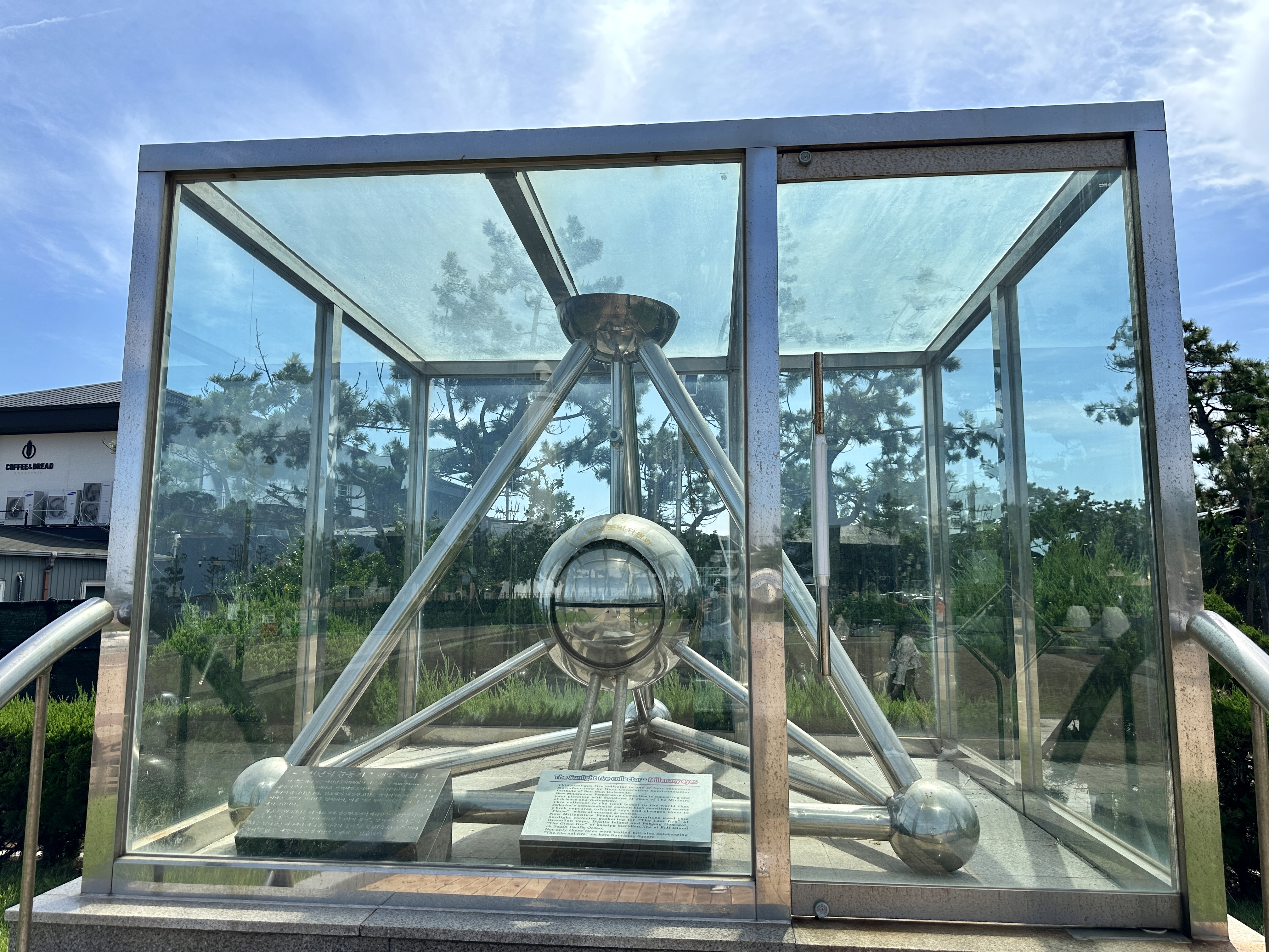 바다위의 상생의 손을 뒤로하고 다시 광장쪽으로 가다보면 왼쪽에 '천년이 눈동자' 햇빛 채화기가 있습니다.