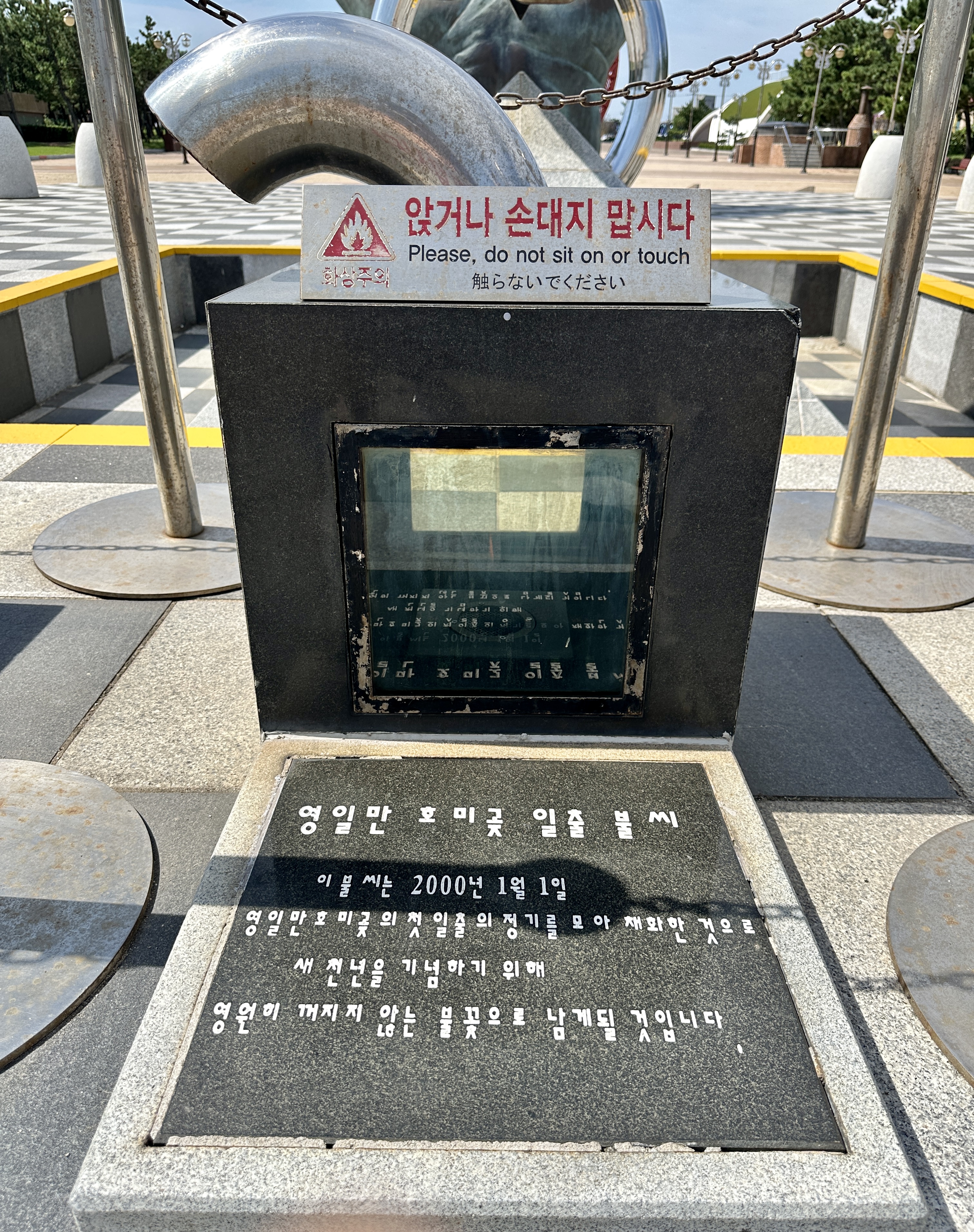 이 '영원의횃불'은 앞에는 왼 손있고 동쪽 바다위에는 오른손이 있는데, 이 손들은 전쟁과 갈등과 배타적인 지난 천년의 '한손의시대' 를 청산하고 평화와 희망과 번영으로 온 인류가 화해하고 서로 돕고 함께 사는 새 천년의 '두 손의 정신'을 형상화한 것이라고 합니다.