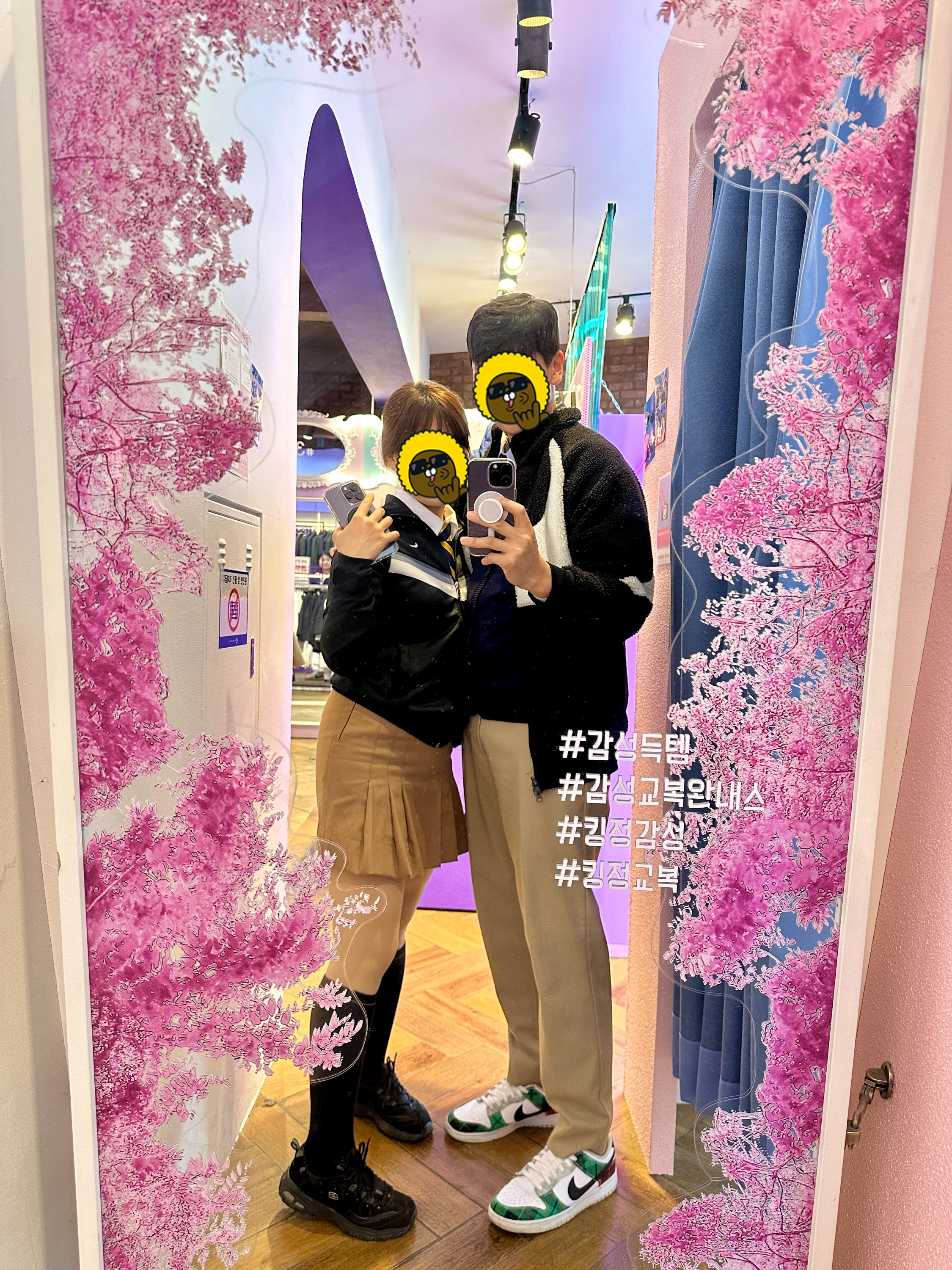 내부에 탈의실이 있어서 교복을 바로 입고 나올 수 있고, 입고 왔던 옷은 감성교복에 맡겨두고 나중에 집에 가기전에 다시 찾으러 와서 환복하면 됩니다.