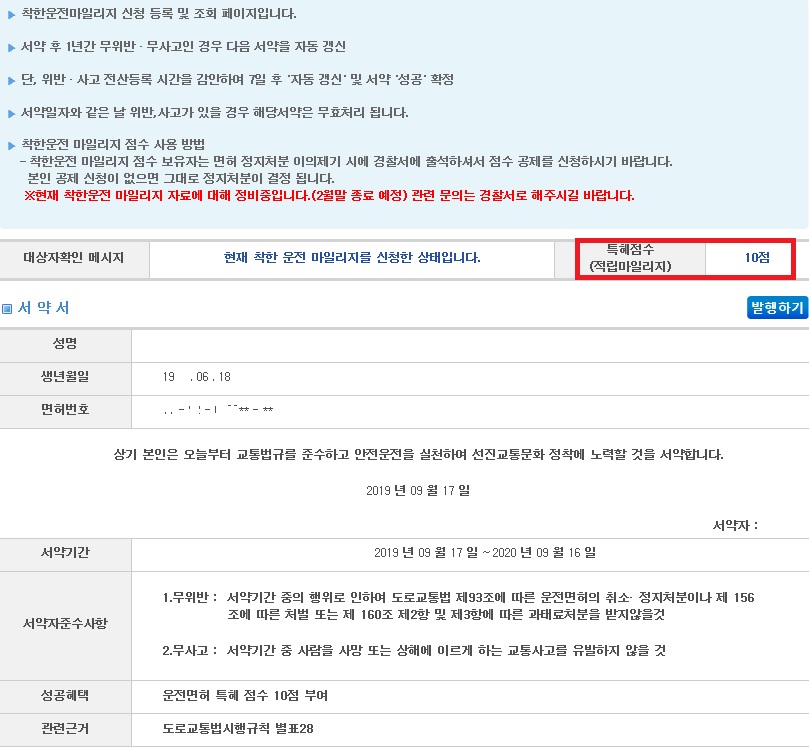 · 서약 횟수에 제한은 없으며, 해마다 무 위반, 무사고 서약을 하고 지키면 마일리지가 10점씩 계속 누적됩니다.