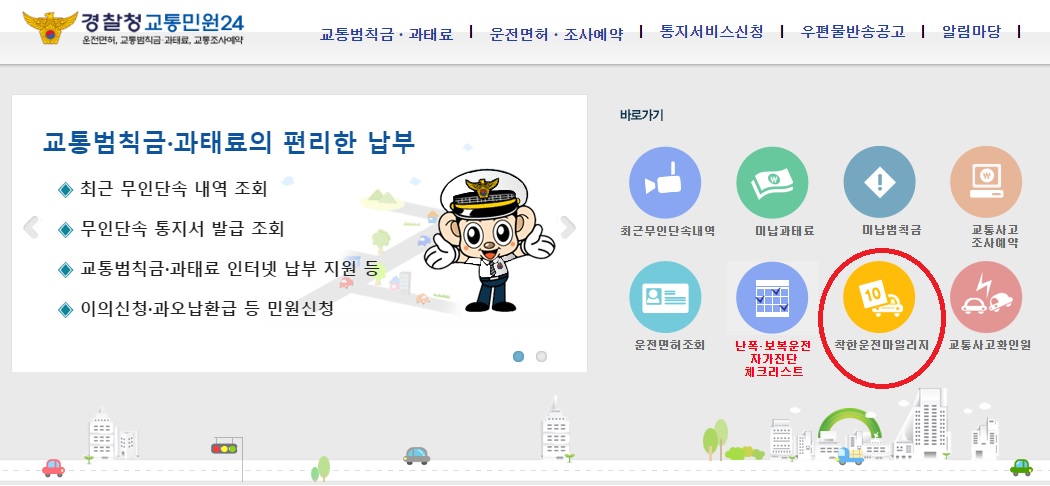 사이트에 들어가서 메인에 보시면 '착한운전마일리지' 표시가 떡하니 있으니