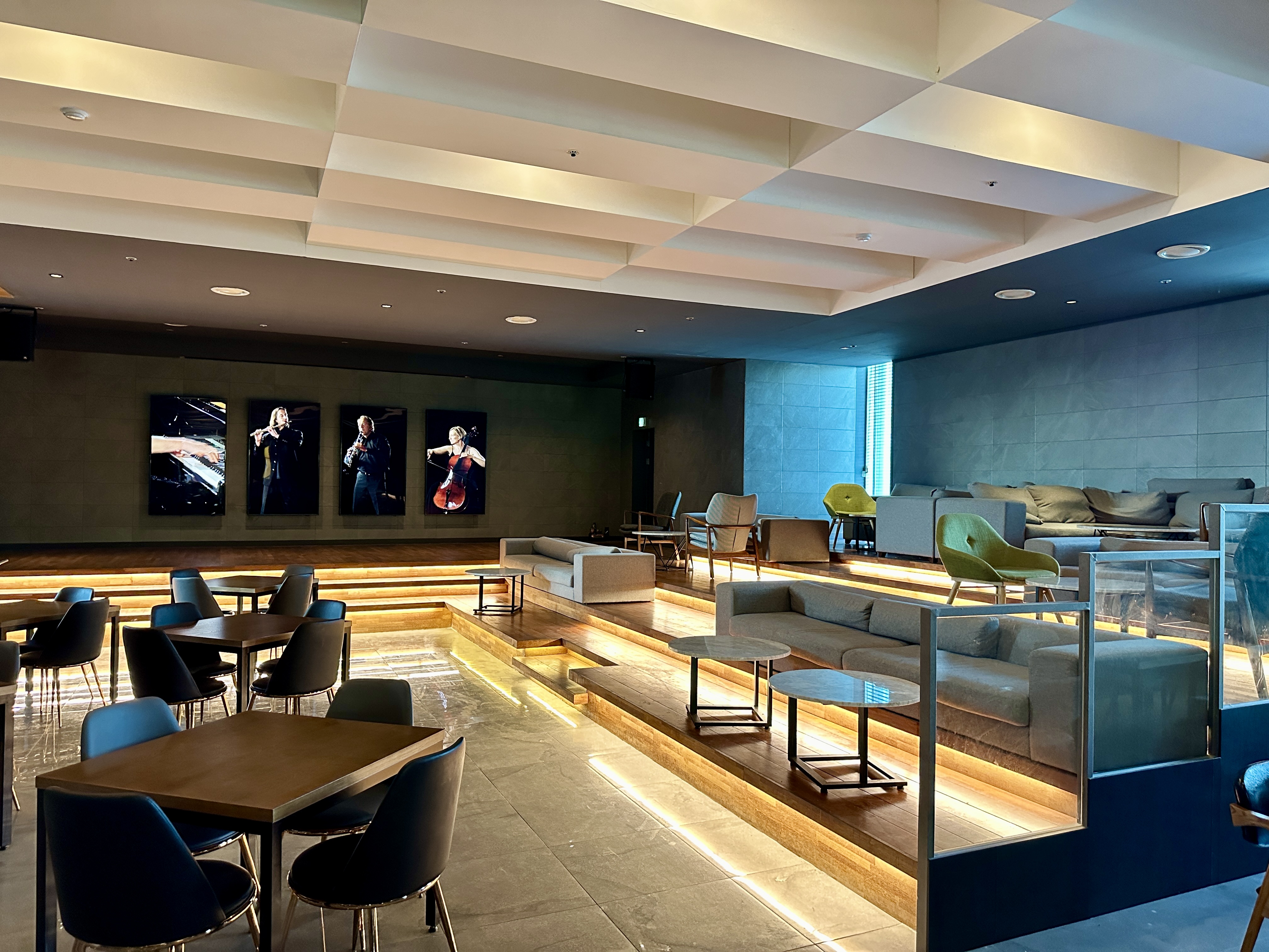 그리고 특이했던 점은 벽면에 연주를 하는 연주자들의 영상이 녹화되어 클래식 음악이 계속해서 나온다는 점입니다.