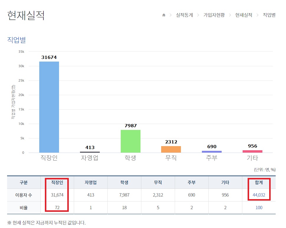 역시나 직장인이 31,674명으로 72% 비중으로 가장 높은 이용자 수 비율을 차지하고 있다.