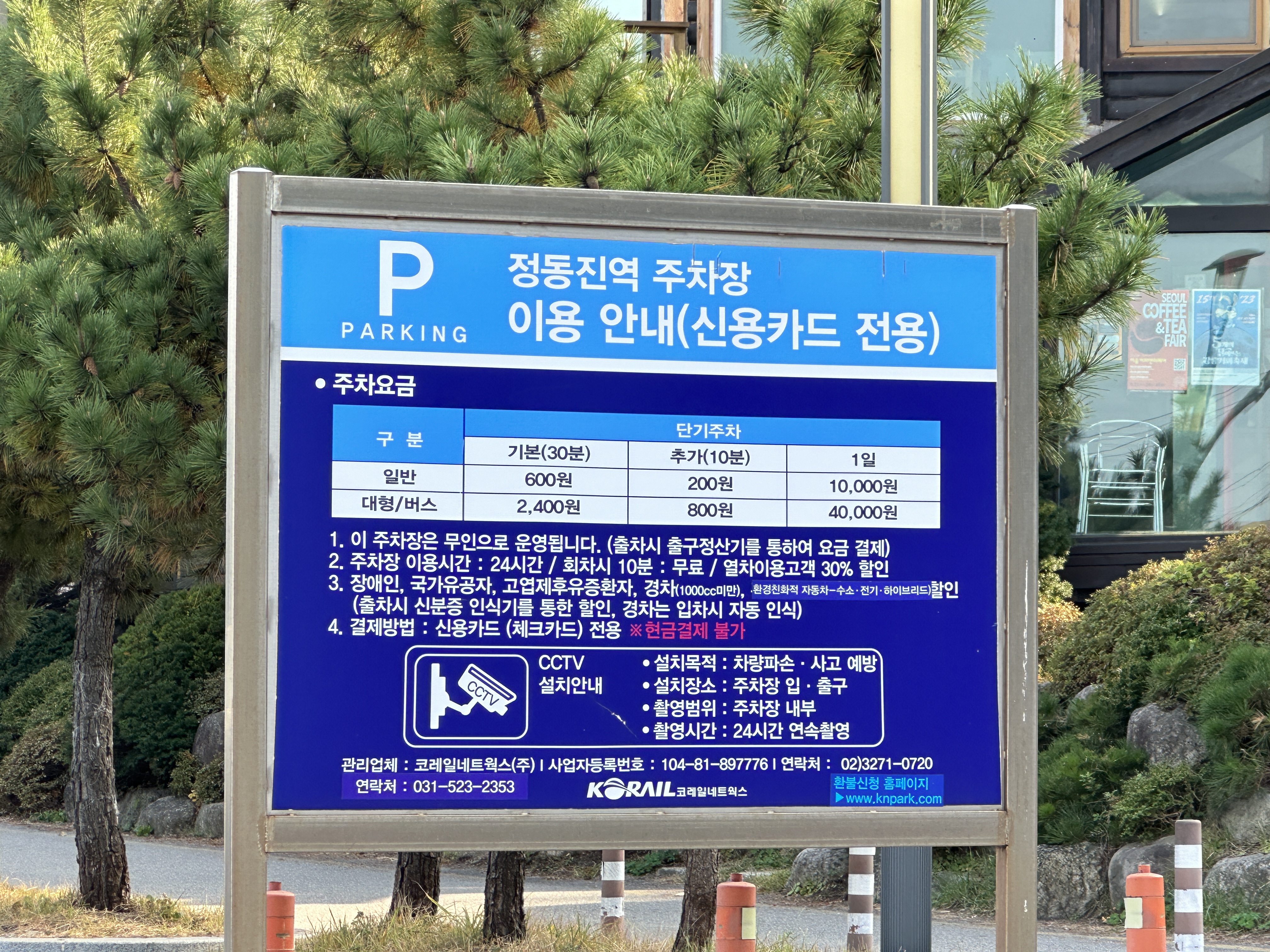 정동진역 주차장은 신용카드 전용 주차장으로 기본 30분에 600원의 요금이 부과됩니다.