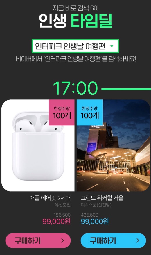 ▲17시에는 인터파크 쇼핑 카테고리 5만원 할인 쿠폰(10만원 이상 결제 시)을 선착순으로 제공한다.