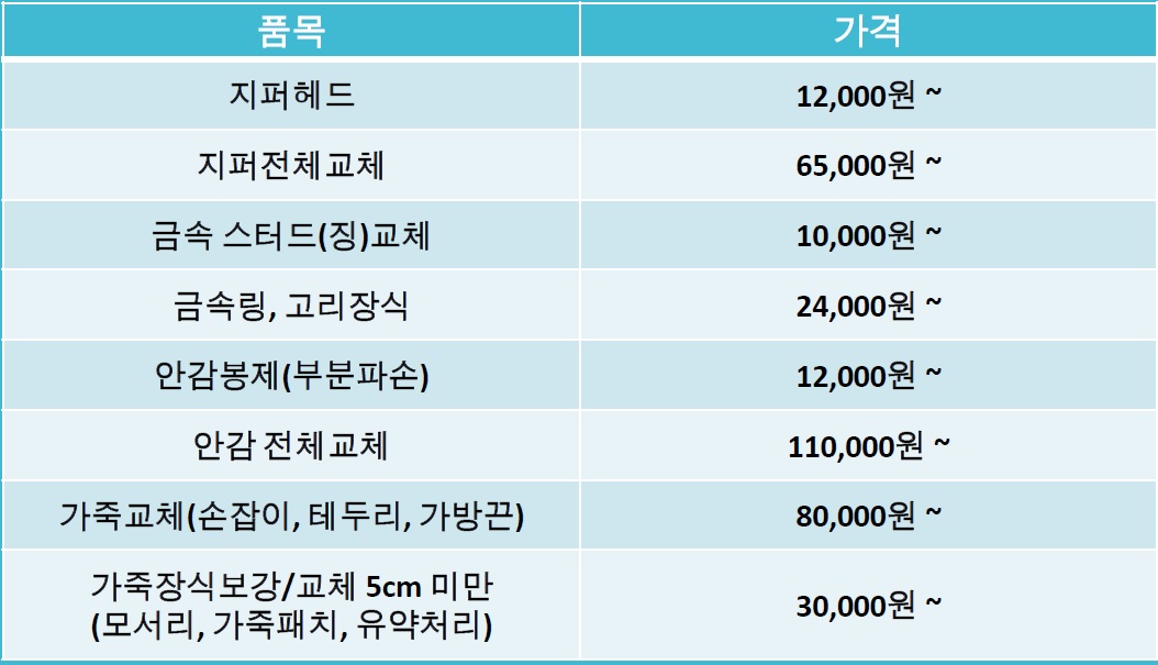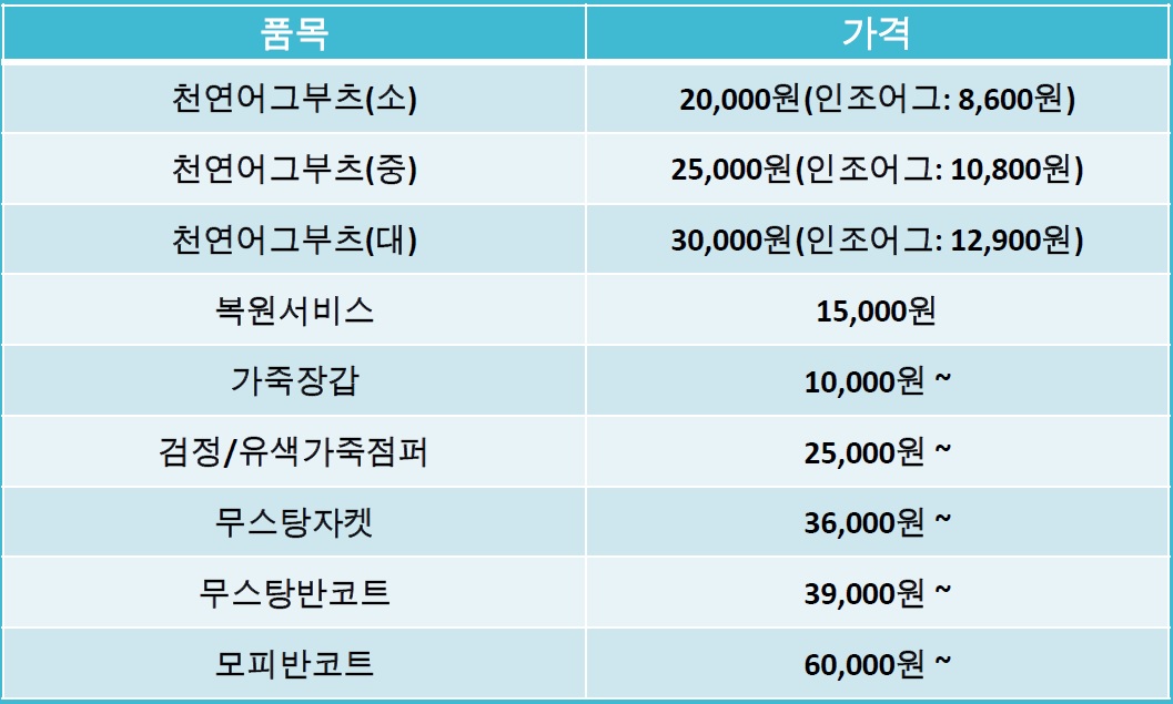 가죽 제품은 장갑이 10,000원 부터~ , 점퍼가 25,000원 부터~ 이다.