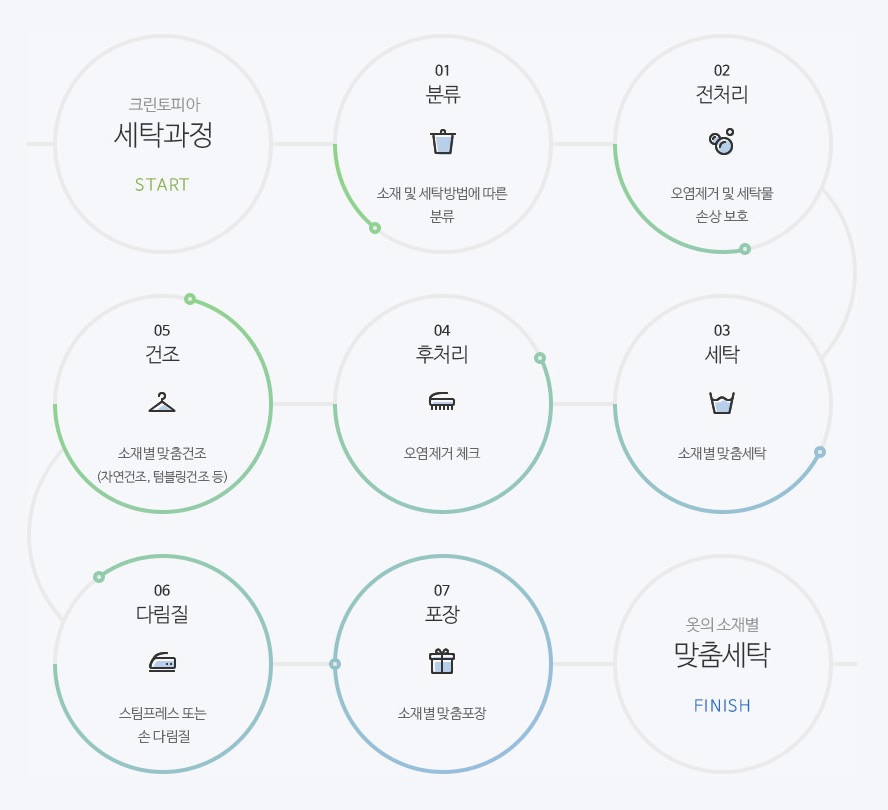 분류->전처리->세탁->후처리->건조->다림질->포장