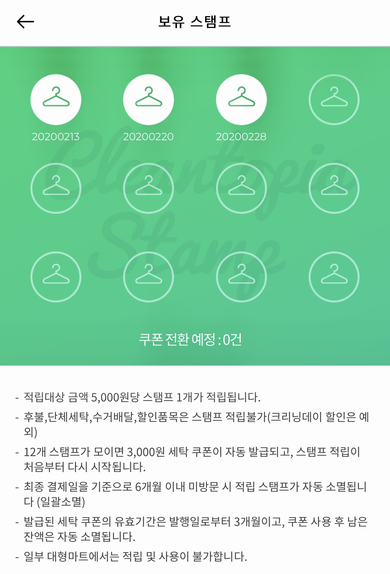 5,000원당 스탬프 1개씩 적립되며, 12개를 다 모으면 3,000원 쿠폰이 발급된다.