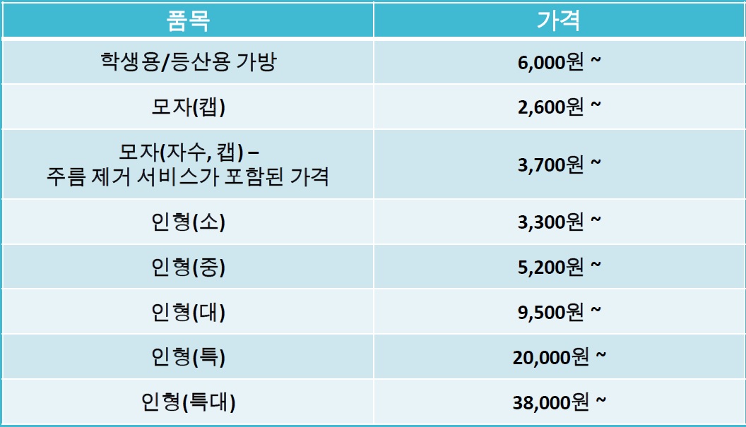 일반의류/와이셔츠/이불/운동화/가죽모피/명품가방/아웃도어/교복/모자/인형/가방/특수크리닝(특수오염제거)/