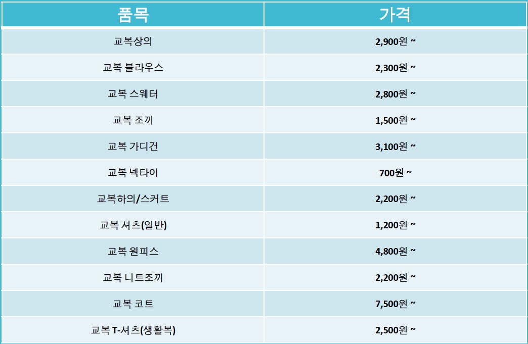 (단, 셔츠(일반)은 2,000원 / 넥타이 3,000원 / 정장상의 5,000원 / 정장하의 4,000원)