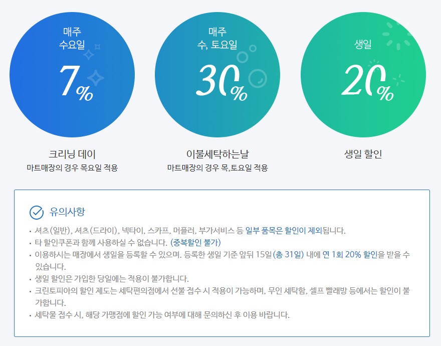 a. 크리닝데이 - 매주 수요일 7% 할인 (마트매장은 목요일 할인적용)