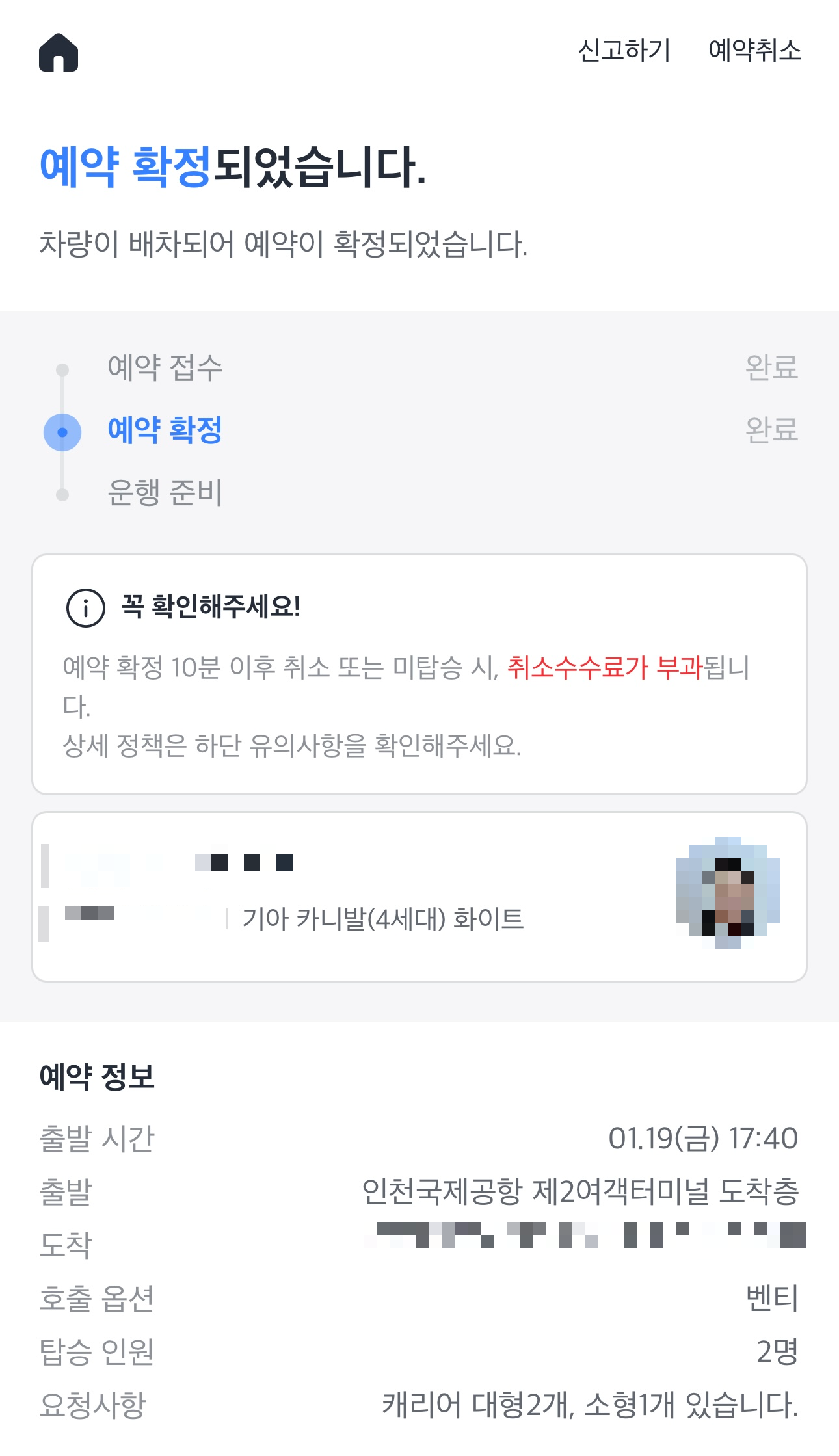 원하는 예약시간과 출발지와 도착지를 넣으면 바로 예약접수가 되고, 얼마지나지 않아 예약확정과 함께 차량 번호와 기사님의 사진이 뜨며 예약이 확정됩니다.
