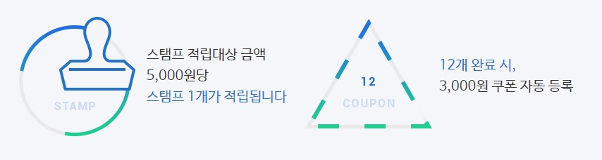 5,000원당 스탬프 1개씩 적립되며, 12개를 다 모으면 3,000원 쿠폰이 발급된다.