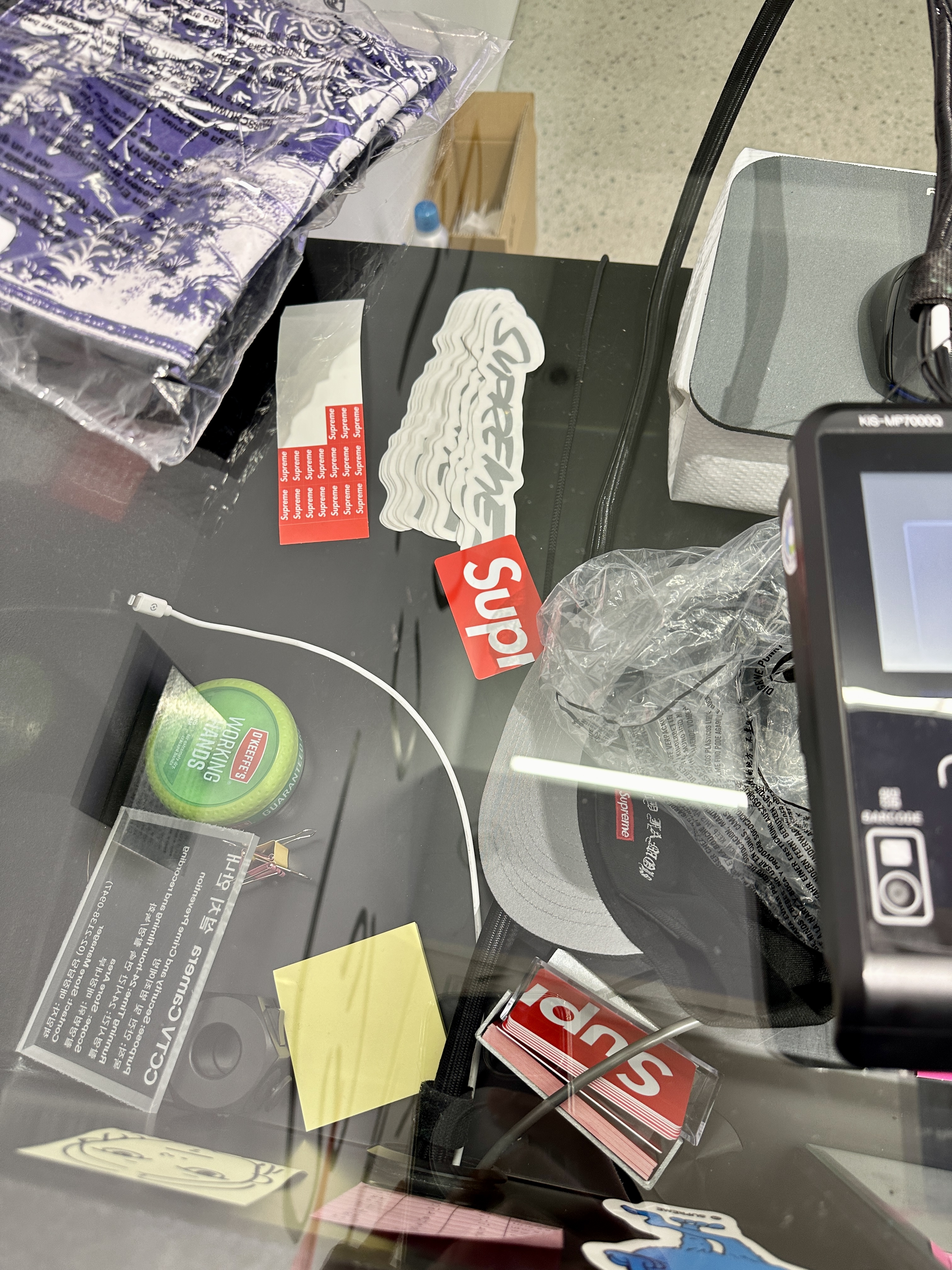 한쪽에 슈프림 모자와 신발종류가 나란히 잘 진열되어 있고, 반대편에는 슈프림 가방들과 양말, 속옷 상의 하의가 포장되어 잘 진열되어 있습니다.