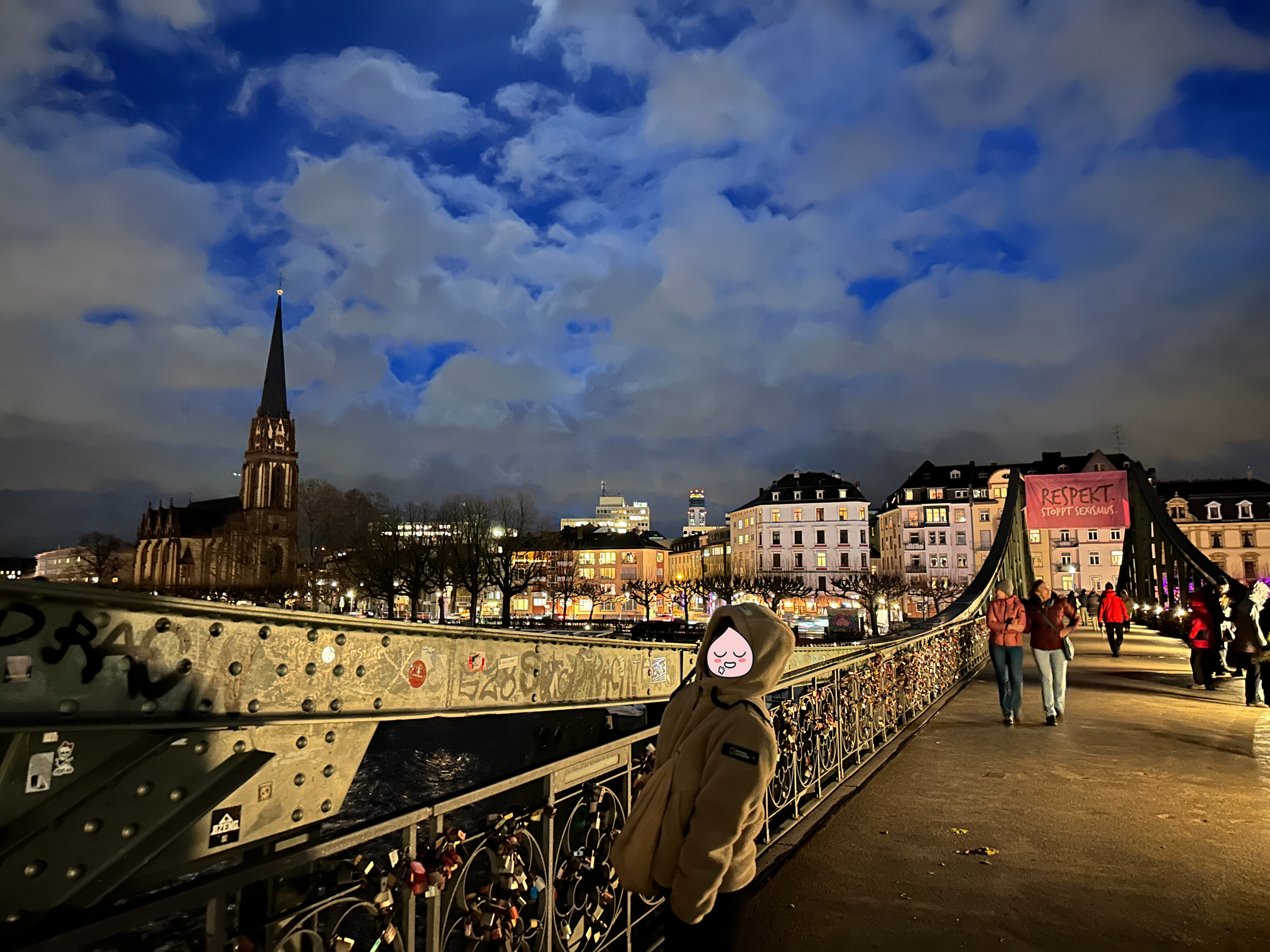 아이젤너 다리 위에서 바라보는 프랑크푸르트 대성당이 특히 더 아름답게 보였고, 다리 난간에 달아놓은 연인들의 사랑의 약속을 담은 사랑의 자물쇠가 길게 이어져 있어 더욱 야경을 아름답게 만들어 주고 있습니다.