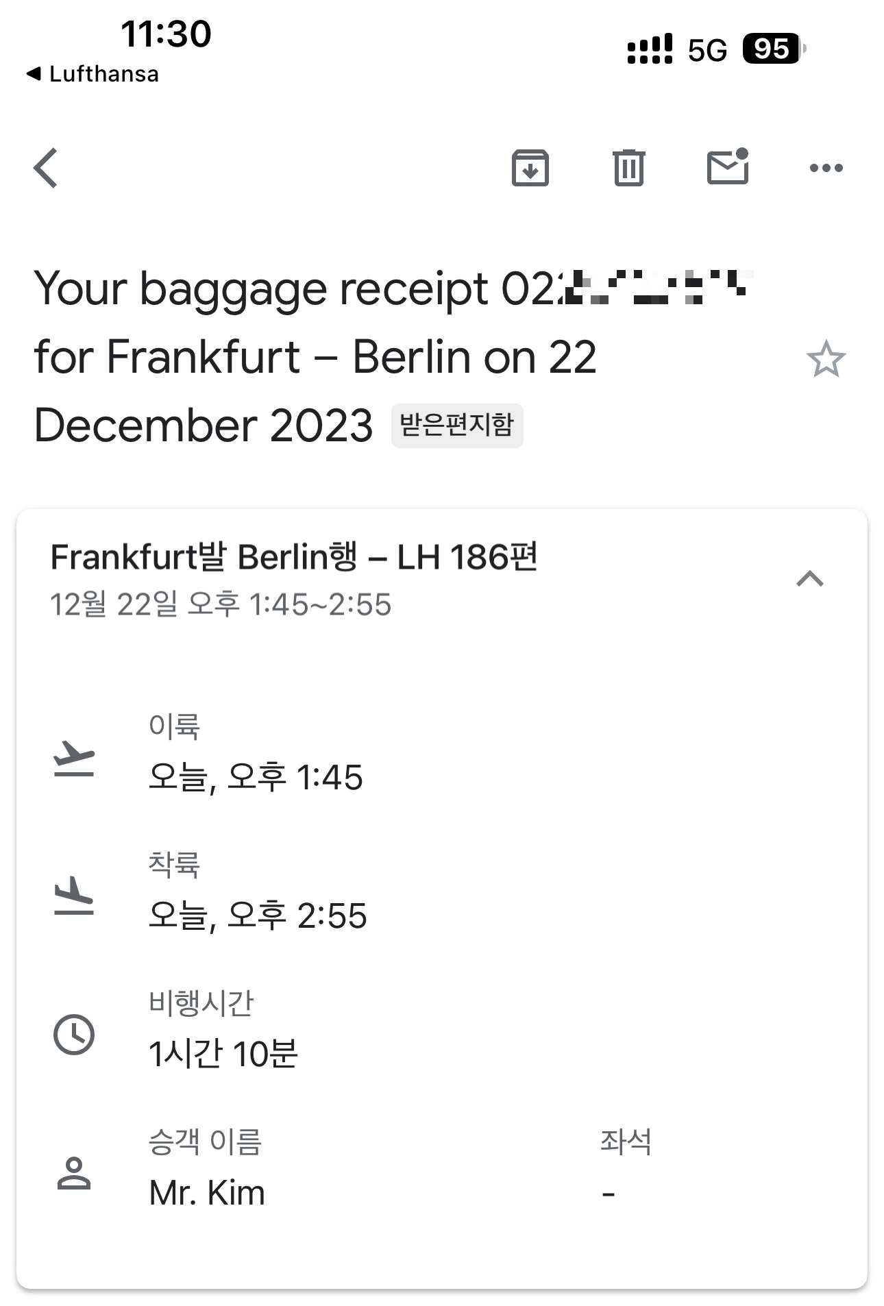 저희는 프랑크푸르트에서 루프트한자 LH186 편을 타고 베를린으로 향했습니다.
